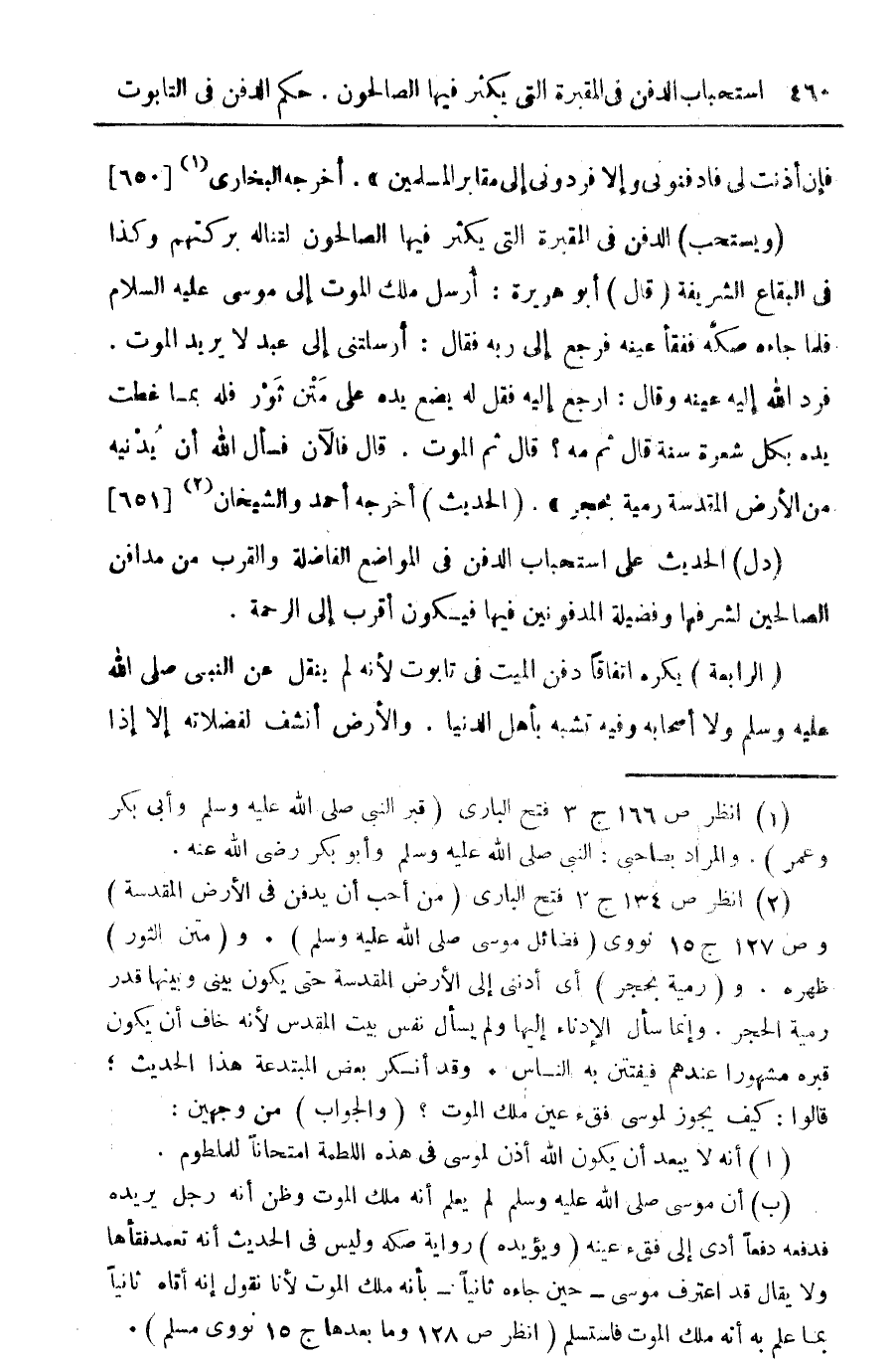 (¬2) انظر ص 134 ج 3 فتح البارى (من أحب أن يدفن فى الرض المقدسة) وص 127 ج 15 نووى (فضائل موسى صلى الله عليه وسلم). و (متن الثور) ظهره. و (رمية بحجر) أى ادننى إلى الأرض المقدسة حتى يكون بينى وبينها قدر رمية الحجر. وإنما سال الإدناه إليها ولم يسال نفس بيت المقدس لأنه خاف أن يكون قبره مشهورا عندهم فيقتين به الناس. وقد أنكر بعض المبتدعة هذا الحديث، قالوا: كيف يجوز لموسى فقء عين ملك الموت؟ (والجواب) من وجهين: