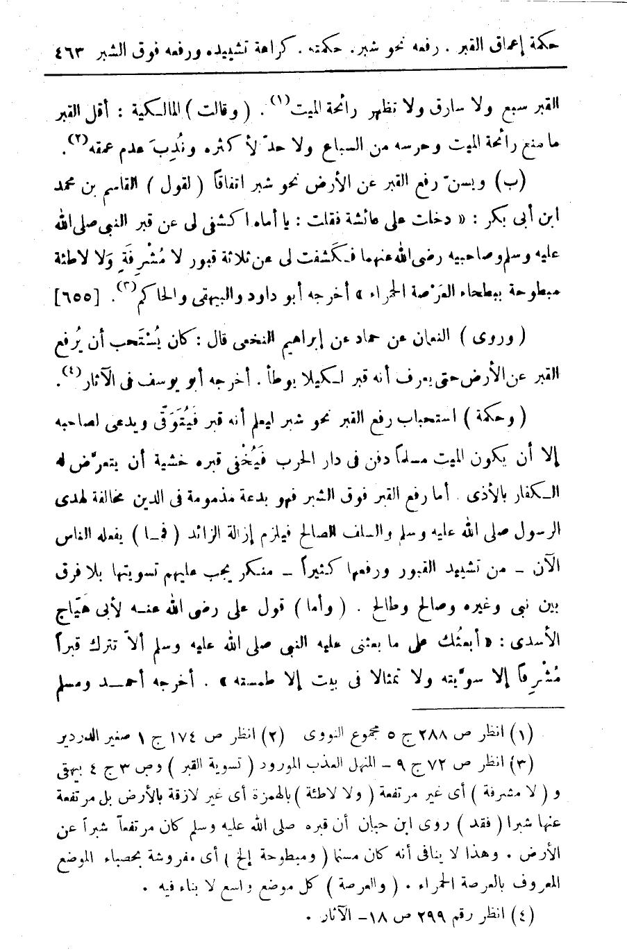 (ب) ويسن رفع القبر عن الأرض نحو شبر اتفاقا (لقول) القاسم بن محمد ابن أبي بكر: " دخلت على عائشة فقلت: يا أماه اكشفي لي في قبر النبي صلى الله عليه وسلم وصاحبيه رضى الله عنهما فكشفت لي عن ثلاثة قبور لا مشرفة ولا لاطئة مبطوحة ببطحاء العرصة الحمراء " أخرجه أبو داود والبيهقى والحاكم (¬3). {655}