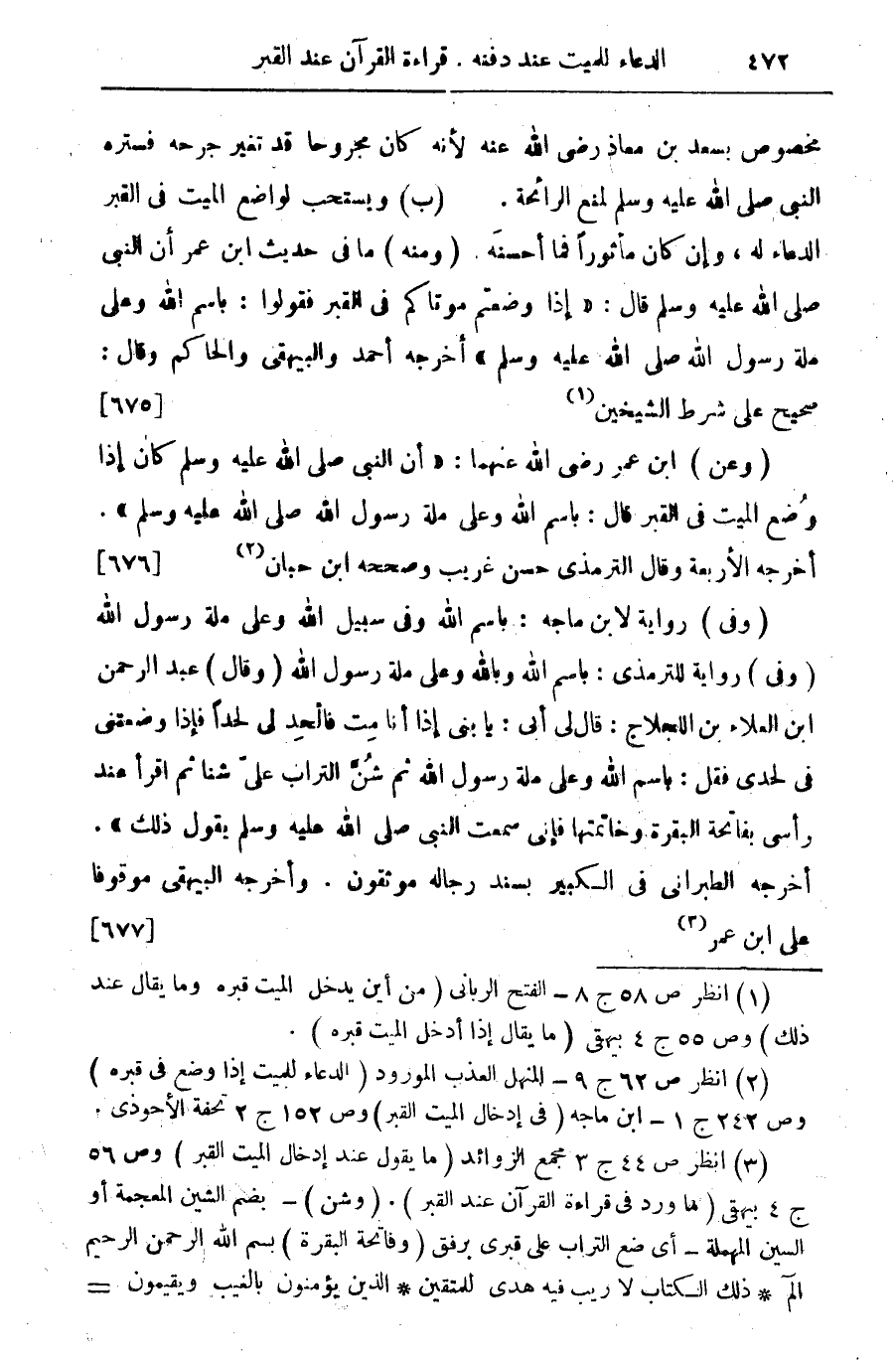 (¬3) انظر ص 44 ج 3 مجمع الزوائد (ما بقول عند إدخال الميت القبر) وص 56 ج 4 بيهقى (ما ورد فى قراءة القرآن عند القبر). (وشن) - بضم الشين المعجمة أو السين المهملة - أى ضع التراب على قبرى برفق (وفاتحة البقرة) (بسم الله الرحمن الرحيم آلم * ذلك الكتاب لا ريب فيه هدى للمتقين * الذين يؤمنون بالغيب ويقيمون الصلاة ومما رزقناهم ينفقون * والذين يؤمنون بما أنزل إليك وما أنزل من قبلك وبالآخرة هم يوقنون * أولئك على هدى من ربهم وأولئك هم المفلحون) وتقدم بيانها بص 133 (علاج الجنون والصرع) وخاتمتها " آمن الرسول بما أنزل اليه من ربه والمؤمنون كل أمن بالله وملائكتة وكتبه ورسله لا نفرق بين أحد من رسله وقالوا سمعنا وأطعنا غفرانك ربنا واليك المصير 285 لا يكلف الله نفسا الا وسعها لها ما كسبت وعليها ما اكتسبت ربنا لا تؤاخذنا إن نسينا أو أخطأنا ربنا ولا تحمل علينا إصرا كما حملته على الذين من قبلنا ولا تحملنا ما لا طاقة لنا به واعف عنا واغفر لنا وارحمنا أنت مولانا فانصرنا على القوم الكافرين 286 " تقدم بيانها بص 203 ج 5 - الدين الخالص.