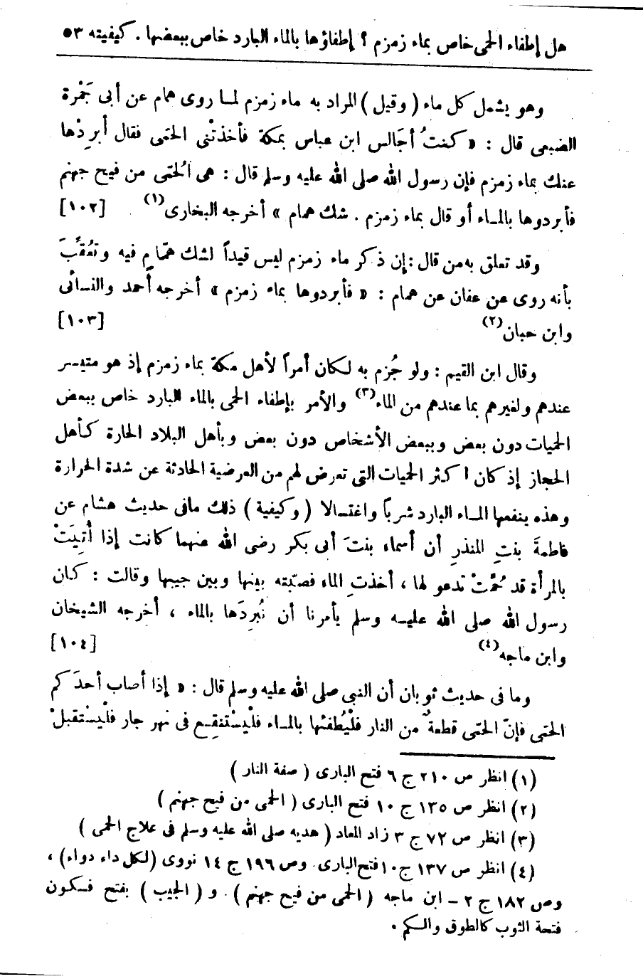 وقال ابن القيم: ولو جزم به لكان أمرا لأهل مكة بماء زمزم إذ هو متيسر عندهم ولغيرهم بما عندهم من الماء (¬3) والأمر بإطفاء الحمى بالماء البارد خاص ببعض الحميات دون بعض وببعض الأشخاص دون بعض وبأهل البلاد الحارة كأهل الحجاز إذ كان اكثر الحميات التي تعرض لهم من العرضية الحادثة عن شدة الحرارة وهذه ينفعها الماء البارد شربا واغتسالا (وكيفية) ذلك ما في حديث هشام عن فاطمة بنت المنذر أن أسماء بنت أبى بكر رضى الله عنهما كانت إذا أتيت بالمرأة قد حمت ندعو لها، أخذت الماء فصبته بينها وبين جبيها وقالت: كان رسول الله صلى الله عليه وسلم يأمرنا أن نبردها بالماء، أخرجه الشيخان وابن ماجه (¬4) {104}