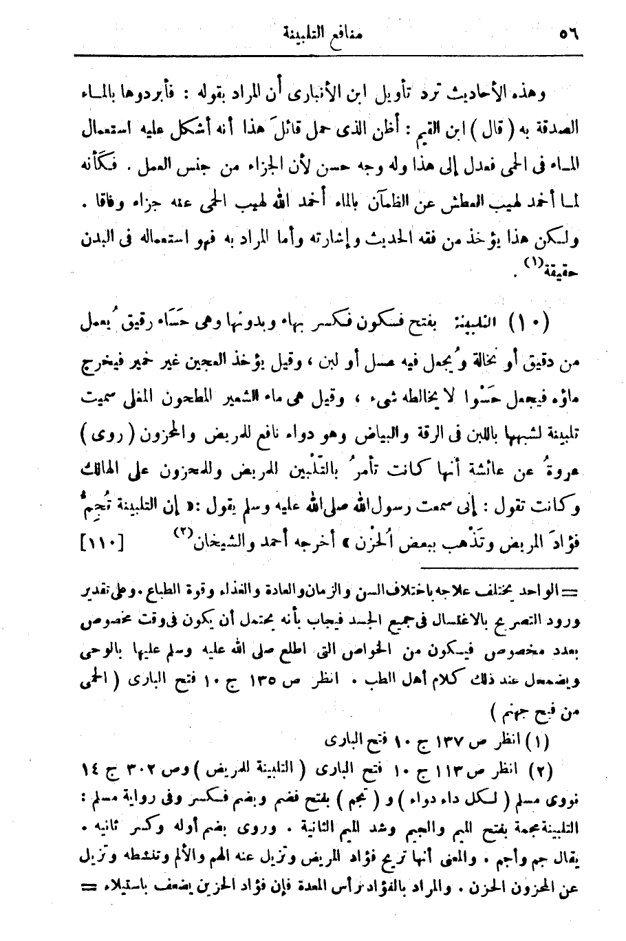 (¬2) انظر ص 113 ج 10 فتح الباري (التلبينة للمريض) وص 302 ج 14 نووي مسلم 0 لكل داء دواء 9 و (تجم 9 بفتح فضم وبضم فكسر وفى رواية مسلم: التلبينة مجمة بفتح الميم والجيم وشد الميم الثانية. وروى بضم أوله وكسر الثانية. يقال جم وأجم. والمعنى أنها تريح قؤاد المريض وتزيل عنه الهم والألم وتنشطه وتزيل عن المخزون الحزن. والمراد بالفؤاد براس المعدة فإن فؤاد الحزين يضعف باستيلاء اليبس على أعضائه وعلى معدته خاصة لتقليل الغذاء والحساء يرطبها ويغذيها ويقويها ويفعل مثل ذلك بفؤاد المريض. لكن المريض كثيرا ما يجتمع في معدته خلط مراري أو بلغمى أو صديدي وهذا الحساء يجلو ذلك عن المعدة. انظر ص 114 ج 10 فتح الباري.