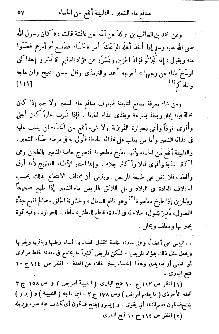 (¬1) انظر ص 113 ج 10 فتح الباري (التلبينة للمريض) وص 158 ج 3 تحفة الأحوذى (ما يطعم المريض) وص 178 ج 2 - ابن ماجه (التلبينة) و (برتو) بفتح فسكون فضم المثناه أى يقوى. و (يسرو) بفتح فسكون أى يكشف عنه ضره ويزيله