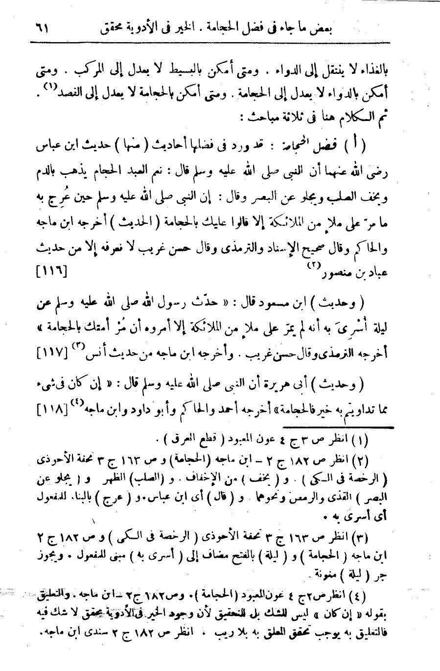 (أ) فضل الحجامة: قد ورد في فضلها أحاديث (منها) حديث ابن عباس رضى الله عنهما أن النبي صلى الله عليه وسلم قال: نعم العبد الحجام يذهب بالدم ويخف الصلب ويجلو عن البصر وقال: إن النبي صلى الله عليه وسلم حين عرج به ما مر على ملا من الملائكة إلا قالوا عليك بالحجامة (الحديث) أخرجه ابن ماجه والحاكم وقال صحيح الإسناد والترمذى وقال حسن غريب لا نعرفه إلا من حديث عباد بن منصور (¬2) {116}