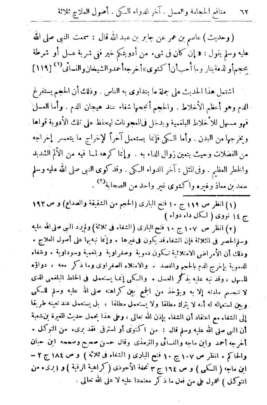 (¬2) انظر ص 107 ج 10 فتح البارى (الشفاء فى ثلاثة) ولم يرد النبى صلى الله عليه وسلم الحصر فى الثلاثة فإن الشفاء قد يكون فى غيرها. وانما نبه بها على اصول العلاج. وذلك أن الأمراض الامتلائية تكون دموية وصفراوية وبلغمية وسوداوية. وشفاء الدموية بإخراج الدم بالحجم والفصد. والامتلاء الصفراوى وما ذكر معه، دواؤه المسهل، وقد نبه عليه بذكر العسل. والكى إنما يستعمل فى الخلط البلغمى الذى لا تنحسم مادته إلا به ويؤخذ من الجمع بين كراهته صلى الله عليه وسلم للكى وبين استعماله له أنه لا يترك مطلقا ولا يستعمل مطلقا، بل يستعمل عند تعيينه طريقا الى الشفاء مع اعتقاد أن الشفاء بإذن الله تعالى، وعلى هذا يحمل حديث المغيرة بن شعبة أن النبى صلى الله عليه وسلم: من اكتوى أو استرقى فقد برئ من التوكل. أخرجه أحمد وابن ماجه والنسائى والترمذى وقال حسن صحيح ابن حبان والحاكم. انظر ص 107 ج 10 فتح البارى (الشفاء فى ثلاثة) وص 184 ج 2 ابن ماجه (الكى) وص 164 ج 3 تحفة الأحوذى (كراهية الرقية) و (برئ من التوكل) محمول على من فعل ما ذكر معتمدا عليه لا على الله تعالى.
