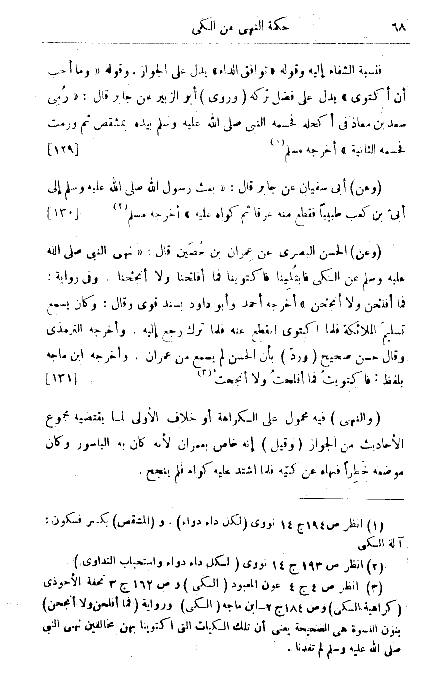 (¬3) انظر ص 4 ج 4 عون المعبود (الكى) وص 162 ج 3 تحفة الأحوذى (كراهية الكى) وص 184 ج 2 ابن ماجه (الكى) ورواية (فما أفلحن ولا أنجحن) بنون النسوة هى الصحيحة يعنى أن تلك الكيات التى اكتوينا بهن مخالفين نهى النبى صلى الله عليه لم تفدنا.
