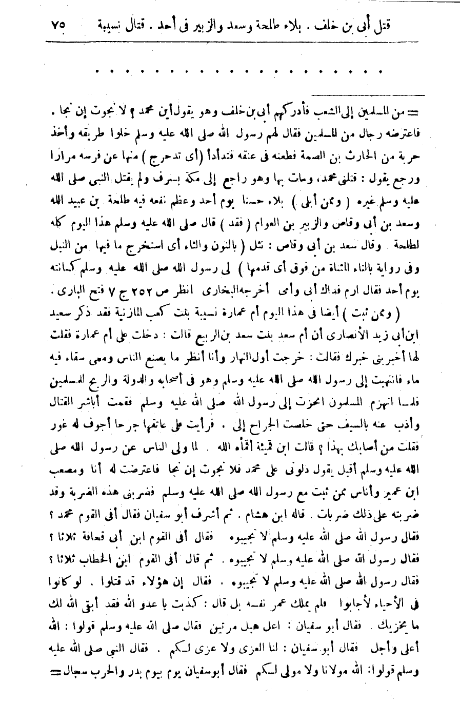 (وممن ثبت) أيضا فى هذا اليوم أم عمارة نسيبة بنت كعب المازنية فقد ذكر سعيد ابن ابى زيد الأنصارى أن أم سعد بنت سعد بن الربيع قالت: دخلت على أم عمارة فقلت لها أخبرينى خبرك فقالت: خرجت أول النهار وأنا أنظر ما يصنع الناس ومعى سقاء فيه ماء فانتهيت الى رسول الله صلى الله عليه وسلم وهو فى أصحابه والدولة والربح للمسلمين فلما انهزم المسلمون انحزت الى رسول الله صلى الله عليه وسلم فقمت أباشر القتال وأذب عنه بالسيف حتى خلصت الجراح الى. فرأيت على عاتقها جرحا أجوف له غور فقلت من اصابك بهذا؟ قالت ابن قميئة أقمأه الله ز لما ولى الناس عن رسول الله صلى الله عليه وسلم أقبل يقول دلونى على محمد فلا نجوت إن نجا فاعترضت له أنا ومصعب ابن عمير وأناس ممن ثبت مع رسول الله صلى الله عليه وسلم فضربنى هذه الضربة وقد ضربته على ذلك ضربات. قاله ابن هشام. ثم أشرف أبو سفيان فقال أفى القوم محمد؟ فقال رسول الله صلى الله عليه وسلم لا تجيبوه فقال افى القوم ابن أبى قحافة ثلاثا؟ فقال رسول الله صلى الله عليه وسلم لا تجيبوه ثم قال افى ابن الخطاب ثلاثا؟ فقال رسول الله صلى الله عليه وسلم لا تجيبوه فقال إن هؤلاء قد قتلوا. لو كانوا فى الأحياء لأجابوا فلم يملك عمر نفسه بل قال: كذبت يا عدو الله فقد ابقى الله لك ما يخزيك. فقال ابو سفيان: اعل هبل مرتين فقال صلى الله عليه وسلم قولوا: الله أعلى وأجل فقال ابو سفيان: انا العزى ولا عزى لكم. فقال النبى صلى الله عليه وسلم قولوا: الله مولانا ولا مولىلكم فقال أبو سفيان يوم بيوم بدر والحرب سجال =