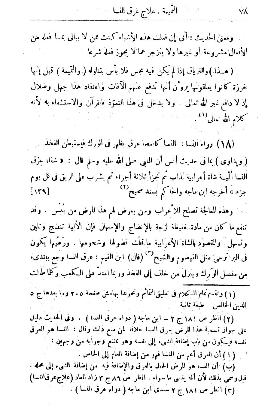 (¬2) انظر ص 181 ج 2 - ابن ماجه (دواء عرق النسا). وفى الحديث دليل على جواز تسمية هذا المرض بعرق النسا خلافا لمن منع ذلك وقال: النسا هو العرق نفسه فيكون من باب اضافة الشئ الى نفسه وهو ممتنع وجوابه من وجهين: