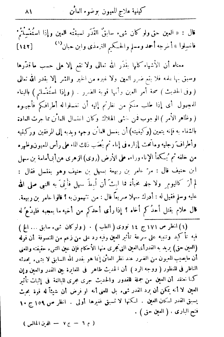 معناه أن الأشياء كلها بقدر الله تعالى ولا تقع إلا على حسب ما قدرها وسبق بها علمه فلا يقع ضرر العين ولا غيره من الخير والشر إلا بقدر الله تعالى (وفى الحديث) صحة أمر العين وأنها قوية الضرر. (وإذا استغسلتم) بالبناء للمجهول آي إذا طلب منكم من نظرتم إليه أن تغسلوا له أطرافكم فأجيوه (وظاهر الأمر) الوجوب فمن خشي الهلاك وكان اغتسال العائن مما جرت العادة بالشفاء به فإنه يتعين (وكيفيته) أن يغسل العائن وجهه ويديه إلى المرفقين وركبتيه وأطراف رجليه وما تحت إزاره في إناء ثم يصب ذلك الماء على راس المعيون وظهره من خلفه ثم يكفأ الإناء وراءه على الأرض (روى) الزهري عن آبى أمامه بن سهل ابن حنيف قال: مر عامر بن ربيعة بسهل بن حنيف وهو يغتسل فقال: لم أر كاليوم ولا جلد مخبأة فما لبث أن لبط سهل فأتى به النبي صلى الله عليه وسلم فقيل له: أدرك سهلا صريعا قال: من تتهمون؟ قالوا عامر بن ربيعة قال علام يقتل أحدكم أخاه؟ إذا رأى أحدكم من أخيه ما يعجبه فليدع