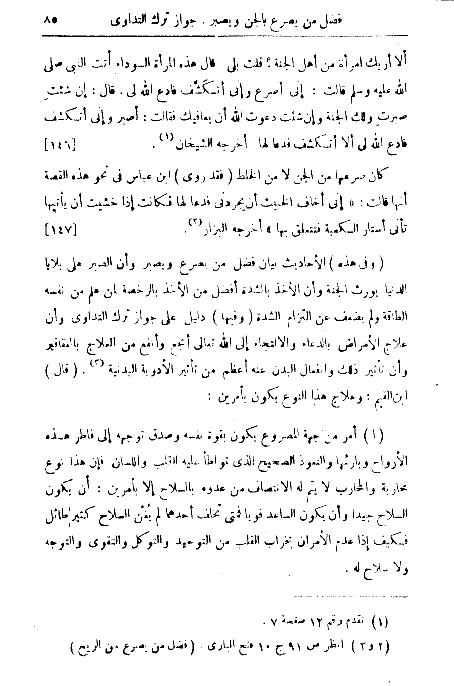 ألا أريك امرأة من أهل الجنة؟ قلت بلى قال هذه المرأة السوداء أتت النبي صلى الله عليه وسلم قالت: إنى اصرع وإنى أتكشف فادع الله لي. قال: إن شئت صبرت ولك الجنة وإن شئت دعوت الله أن يعافيك فقالت: اصبر وإنى أتكشف فادع الله لي ألا أتكشف فدعا لها أخرجه الشيخان (¬1) {146}