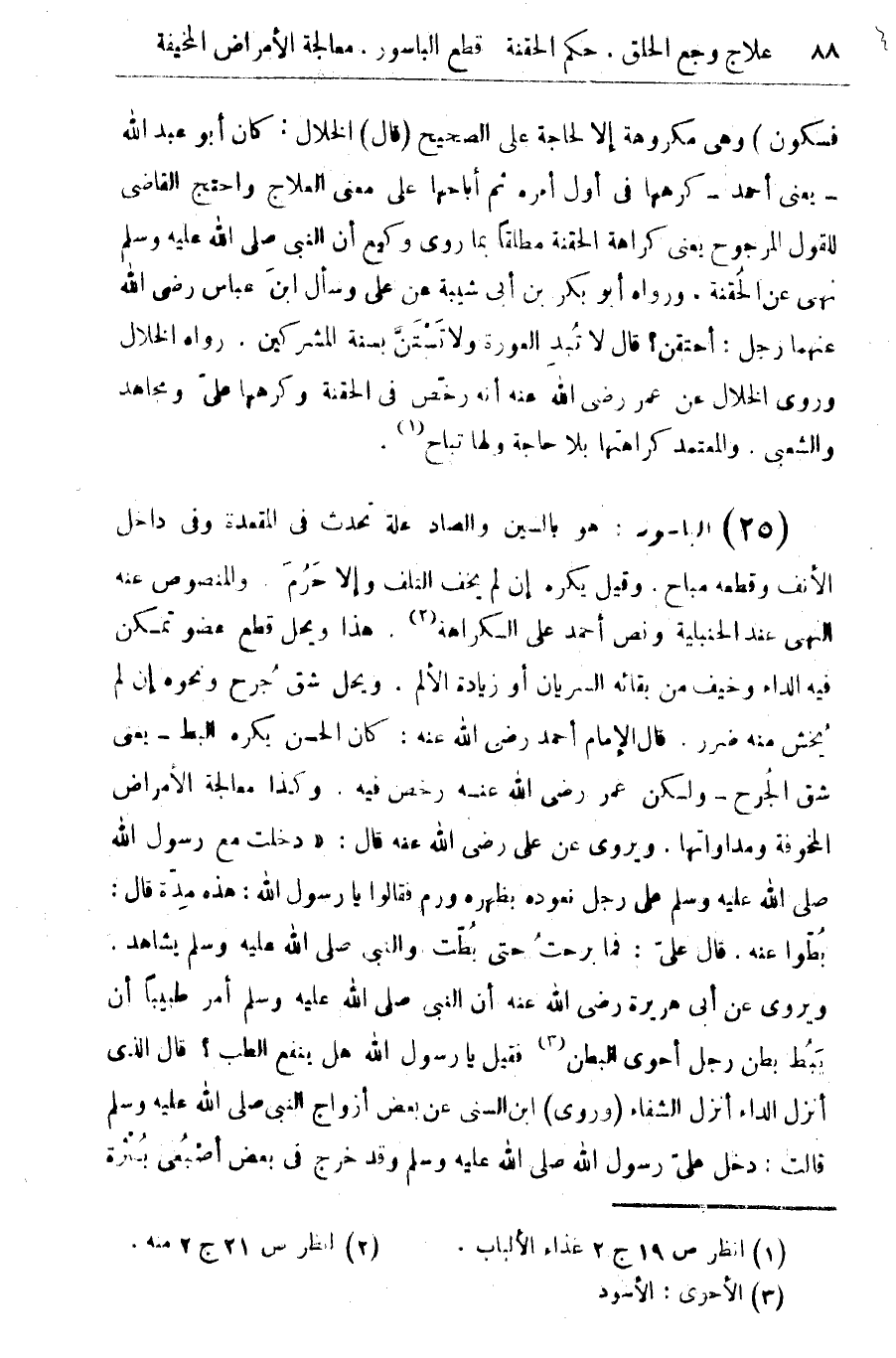 (25) الباسور: هو بالسين والصاد علة تحدث في المقعدة وفى داخل الأنف وقطعة مباح. وقيل يكره إن لم يخف التلف وإلا حرم والمنصوص عنه النهى عند الحنبلية ونص أحمد على الكراهة (¬2) هذا ويحل قطع عضو تمكن فيه الداء وخيف من بقائه السريان أو زيادة الألم. ويحل شق جرح ونحوه إن لم يخش منه ضرر. قال الإمام أحمد رضى الله عنه: كان الحسن يكره البط - يعنى شق الجرح - ولكن عمر رضى الله عنه رخص فيه وكذا معالجة الأمراض المخوفة ومداواتها ويروى عن على رضى الله عنه قال: " دخلت مع رسول الله صلى الله عليه وسلم على رجل نعوده بظهره ورم فقالوا يا رسول الله: هذه مدة قال: بطوا عنه. قال على: فما ربحت حتى بطن مادي صلى الله عليه وسلم أمر طبيبا أن يبط بطن رجل أحوى البطن (¬3) فقيل يا رسول الله هل ينفع الطب؟ قال الذي انزل الداء أنزل الشفاء (وروى) ابن السنى عن بعض أزواج النبي صلى الله عليه وسلم قالت: دخل على رسول الله صلى الله عليه وسلم وقد خرج في بعض أصبعى بثرة