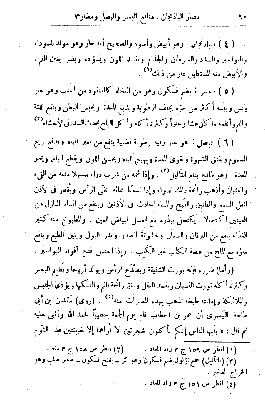 (4) الباذنجان: وهو أبيض واسود والصحيح أنه حار وهو مولد للسوداء والبواسير والسدد والسرطان والجذام ويفسد اللون ويسوده ويضر بنتن الفم والأبيض منه المستطيل عار من ذلك (¬1)