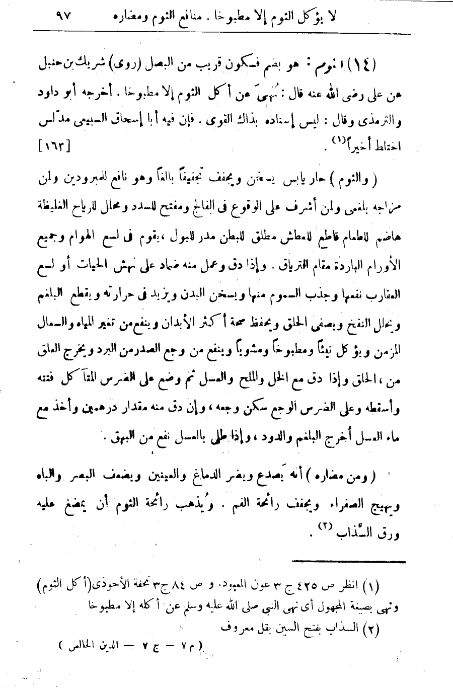 (¬1) انظر ص 425 ج 3 عون المعبود وص 84 ج 3 تحفة الأحوذى (أكل الثوم وتهى بصيغة المجهول أى نهى النبى صلى الله عليه وسلم عن أكله الا مطبوخا