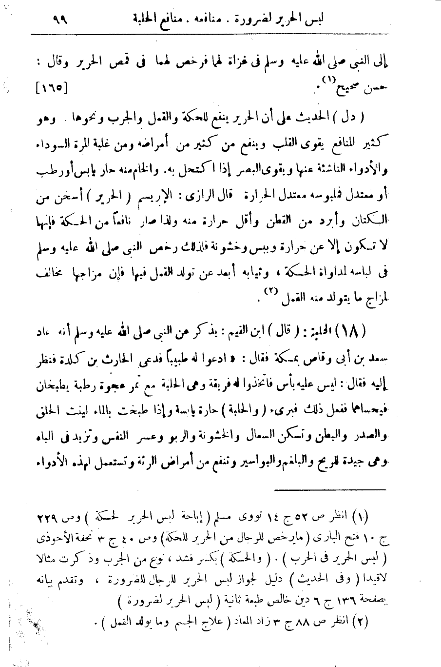 (¬1) انظر ص 52 ج 14 نووى مسلم (اباحة لبس الحرير لحكة) وص 229 ج 10 فتح البارى (ما يرخص للرجال من الحرير للحكة) وص 40 ج 3 تحفة الأحوذى (لبس الحرير فى الحرب). (والحكة) بكسر فشد، نوع من الجرب وذكرت مثالا لاقيدا (وفى الحديث) دليل لجواز لبس الحرير للرجال للضرورة، وتقدم بيانه بصفحة 136 ج 6 دين خالص طبعة ثانية (لبس الحرير لضرورة).