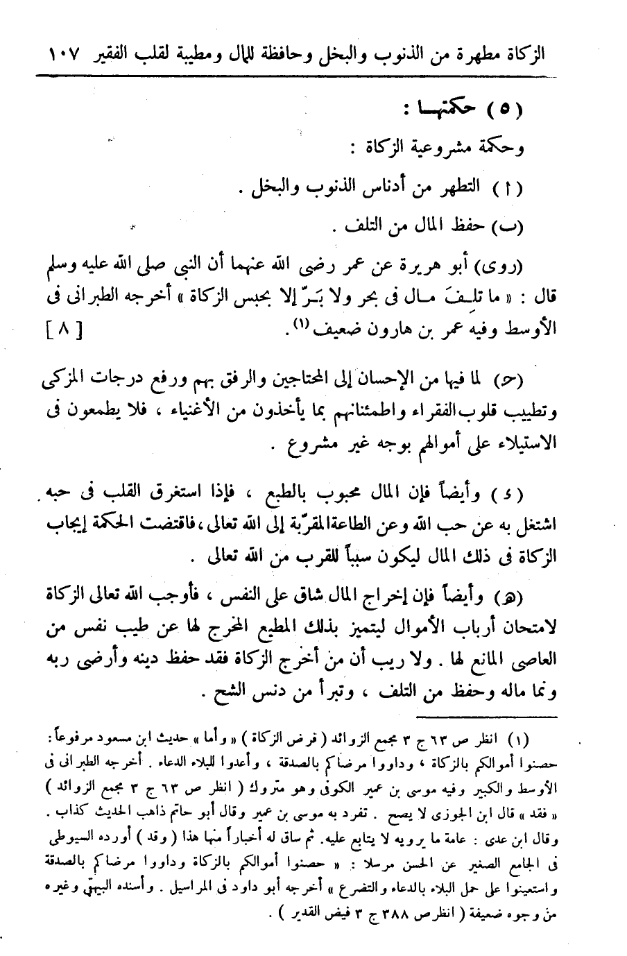 ... (هـ) وأيضا فإن إخراج المال شاق على النفس، فأوجب الله تعالى الزكاة لامتحان أرباب الأموال ليتميز بذلك المطيع المخرج لها عن طيب نفس من العاصي المانع لها. ولا ريب أن من أخرج الزكاة فقد حفظ دينه وأرضى ربه ونما ماله وحفظ من التلف، وتبرأ من دنس الشح.