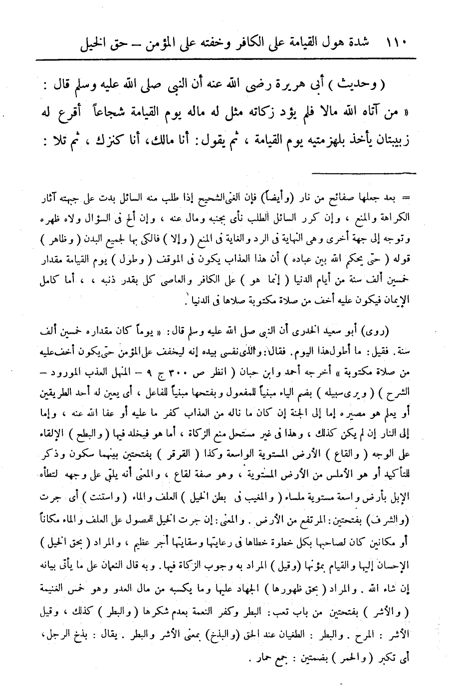 ... (روى) أبو سعيد الخدري أن النبي صلى الله عليه وسلم قال: "يوما كان مقداره خمسين ألف سنة. فقيل: ما أطول هذا اليوم. فقال: والذي نفسي بيده إنه ليخفف على المؤمن حتى يكون أخف عليه من صلاة مكتوبة" أخرجه أحمد وابن حبان (انظر ص 300 ج 9 - المنهل العذب المورود- الشرح) (ويرى سبيله) بضم الياء مبنيا للمفعول وبفتحها مبنيا للفاعل، أي يعين له أحد الطريقين أو يعلم هو مصيره إما إلى الجنة إن كان ما ناله من العذاب كفر ما عليه أو عفا الله عنه، وإما إلى النار إن لم يكن كذلك، وهذا في غير مستحل منع الزكاة، أما هةو فيخلد فيها (والبطح) الإلقاء على الوجه (والقاع) الأرض المستوية الواسعة وكذا (القرقر) بفتحتين بينهما سكون وذكر للتأكيد أو هو الأملس من الأرض المستوية، وهو صفة لقاع، والمعنى أنه يلقى على وجهه لتطأه الإبل بأرض واسعة مستوية ملساء (والمغيب في بطن الخيل) العلف والماء (واستنت) أي جرت (والشرف) بفتحتين: المرتفع من الأرض. والمعنى: إن جرت الخيل للحصول على العلف والماء مكانا أو مكانين كان لصاحبها بكل خطوة خطاها في رعايتها وسقايتها أجر عظيم، والمراد (بحق الخيل) الإحسان إليها والقيام بمؤنها (وقيل) المراد به وجوب الزكاة فيها. وبه قال النعمان على ما يأتي ببيانه إن شاء الله. والمراد (بحق ظهورها) الجهاد عليه وما يكسبه من مال العدو وهو خمس الغنيمة (والأثر) بفتحتين من باب تعب: البطر وكفر النعمة بعدم شكرها (والبطر) كذلك، وقيل الأشر: المرح. والبطر: الطغيان عند الحق (والبذخ) بمعنى الأشر والبطر. يقال: بذخ الرجل، أي تكبر (والحمر) بضمتين جمع حمار.