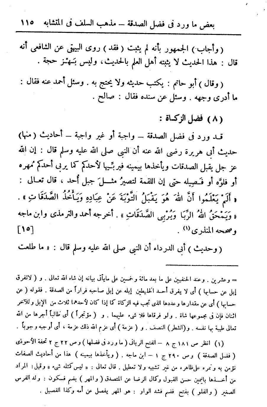 قد ورد في فضل الصدقة- واجبة أو غير واجبة - أحاديث (منها) حديث أبي هريرة رضي الله عنه أن النبي صلى الله عليه وسلم قال: إن الله عز وجل يقبل الصدقات ويأخذها بيمينه فيربيها لأحدكم كما يربي أحدكم مهره أو فلوه أو فصيله حتى إن اللقمة لتصير مثل جبل أحد، قال تعالى: "ألم يعلموا أن الله هو يقبل التوبة عن عباده ويأخذ الصدقات". "ويمحق الله الربا ويربي الصدقات". أخرجه أحمد والترمذي وابن ماجه وصححه المنذري (¬1). {15}
