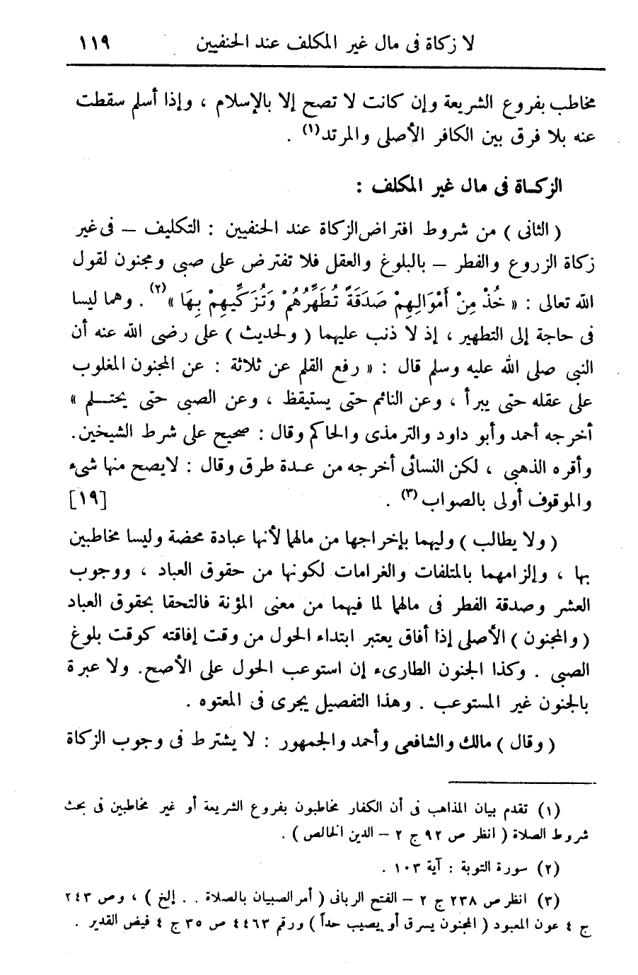 ... (الثاني) من شروط افتراض الزكاة عند الحنفيين: التكليف- في غير زكاة الزروع والفطر- بالبلوغ والعقل فلا تفترض على صبي ومجنون لقول الله تعالى: "خذ من أموالهم صدقة تطهرهم وتزكيهم بها" (¬2). وهما ليسا في حاجة إلى التطير، إذ لا ذنب عليهما (ولحديث) علي رضي الله عنه أن النبي صلى الله عليه وسلم قال: "رفع القلم عن ثلاثة: عن المجنون المغلوب على عقله حتى يبرأ، وعن النائم حتى يستيقظ، وعن الصبي حتى يحتلم" أخرجه أحمد وأبو داود والترمذي والحاكم وقال: صحيح على شرط الشيخين. وأقره الذهبي، لكن النسائي أخرجه من عدة طرق وقال: لا يصح منها شيء والموقوف أولي بالصواب (¬3). {19}