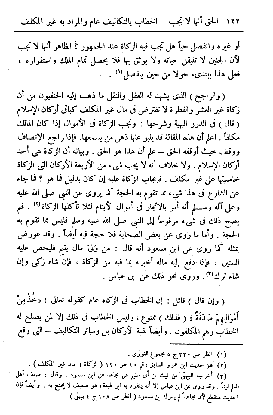 (وإن قال) قائل: إن الخطاب في الزكاة عام كقوله تعالى: "خذ من أموالهم صدقة" (فذلك) ممنوع، وليس الخطاب في ذلك إلا لمن يصلح له الخطاب وهم المكلفون. وأيضا بقية الأركان بل وسائر التكاليف- التي وقع