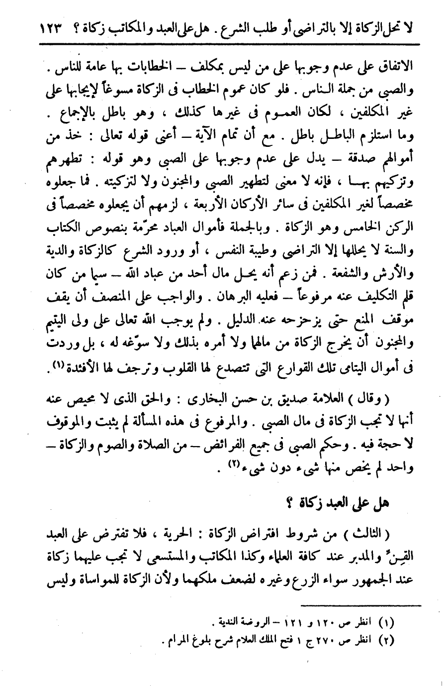 ... (وقال) العلامة صديق بن حسن البخاري: والحق الذي لا محيص عنه أنها لا تجب الزكاة في مال الصبي. والمرفوع في هذه المسألة لم يثبت والموقوف لا حجة فيه. وحكم الصبي في جميع الفرائض- في الصلاة والصوم والزكاة- وأحد لم يخص منها شيء دون شيء (¬2).