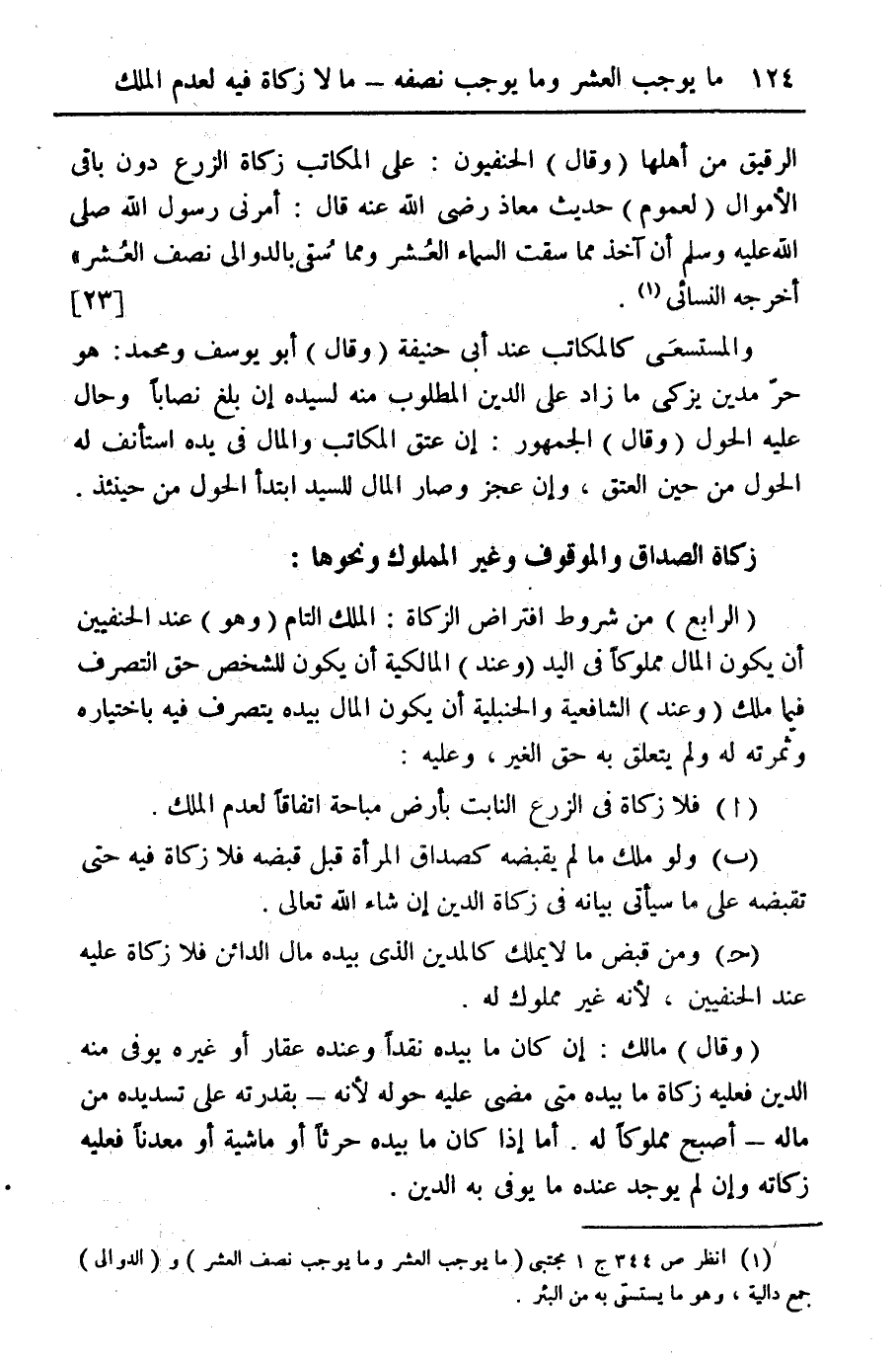 الرقيق من أهلها (وقال) الحنفيون: على المكاتب زكاة الزرع دون باقي الأموال (لعموم) حديث معاذ رضي الله عنه قال: أمرني رسول الله صلى الله عليه وسلم أن آخذ مما سقت السماء العشر ومما سقى بالدوالي نصف العشر" أخرجه النسائي (¬1). {23}