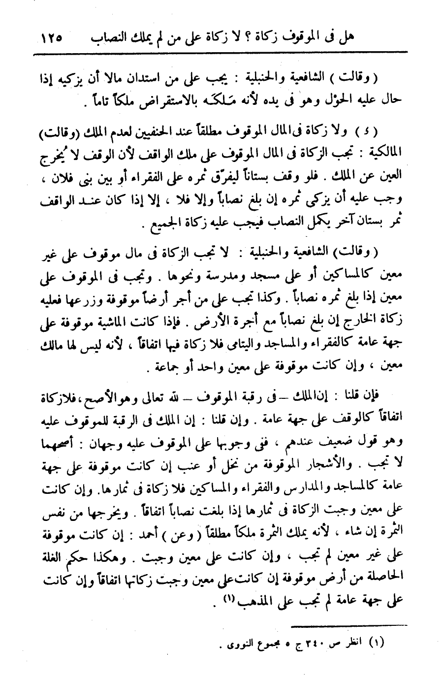 ... (د) ولا زكاة في المال الموقوف مطلقا عند الحنفيين لعدم الملك (وقالت) المالكية: تجب الزكاة في المال الموقوف على ملك الواقف لأن الوقف لا يخرج العين عن الملك. فلو وقف بستانا ليفرق ثمره على الفقراء أو بين بني فلان، وجب عليه أن يزكى ثمره إن بلغ نصابا وإلا فلا، إلا إذا كان عند الواقف ثمر بستان آخر يكمل النصاب فيجب عليه زكاة الجميع.