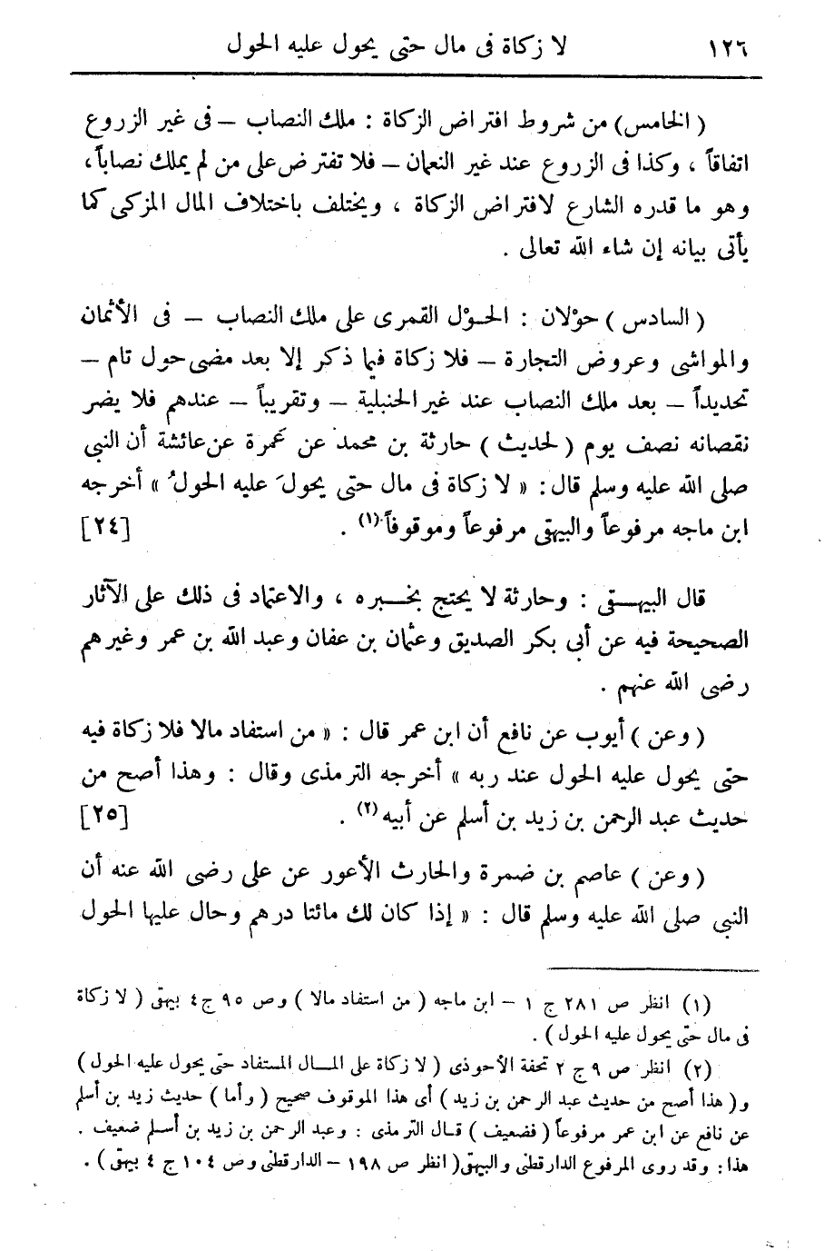 ... (السادس) حولان: الحول القمري على ملك النصاب- في الأثمان والمواشي وعروض التجارة- فلا زكاة فيما ذكر إلا بعد مضي حول تام- تحديدا- بعد ملك النصاب عند غير الحنبلية- وتقريبا- عندهم فلا يضر نقصانه نصف يوم (لحديث) حارثة بن محمد عن عمرة عن عائشة أن النبي صلى الله عليه وسلم قال: "لا زكاة في مال حتى يحول عليه الحول" أخرجه ابن ماجه مرفوعا والبيهقي مرفوعا وموقوفا (¬1). {24}
