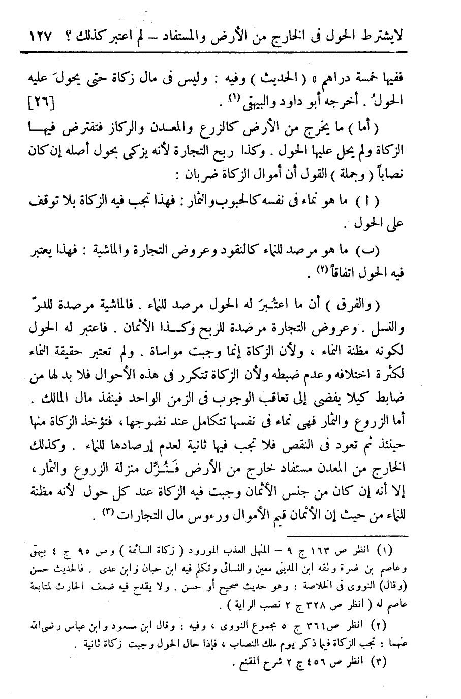 ففيها خمسة دراهم" (الحديث) وفيه: وليس في مال زكاة حتى يحول عليه الحول. أخرجه أبو داود والبيهقي (¬1). {26}
