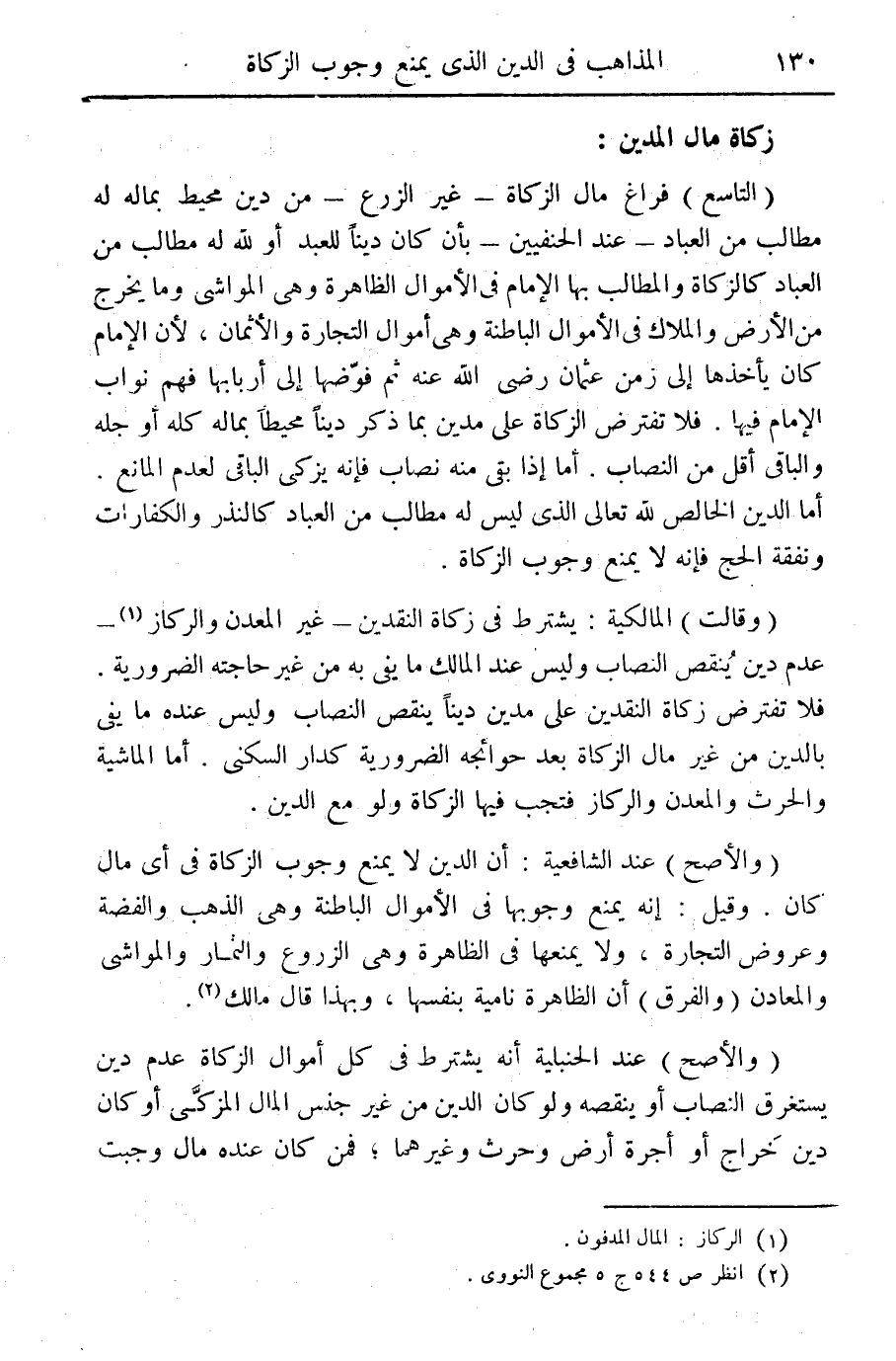 ... (التاسع) فراغ مال الزكاة- غير الزرع- من دين محيط بماله له مطالب من العباد- عند الحنفيين- بأن كان دينا للعبد أو لله له مطالب من العباد كالزكاة والمطالب بها الإمام في الأموال الظاهرة وهي المواشي وما يخرج من الأرض والملاك في الأموال الباطنة وهي أموال التجارة والأثمان، لأن الإمام كان يأخذها إلى زمن عثمان رضي الله عنه ثم فوضها إلى أربابها فهم نواب الإمام فيها. فلا تفترض الزكاة على مدين بما ذكر دينا محيطا بماله كله أو جله والباقي أقل من النصاب. أما إذا بقى منه نصاب فإنه يزكى الباقي لعدم المانع. أما الدين الخالص لله تعالى الذي ليس له مطالب من العباد كالنذر والكفارات ونفقة الحج فإنه لا يمنع وجوب الزكاة.