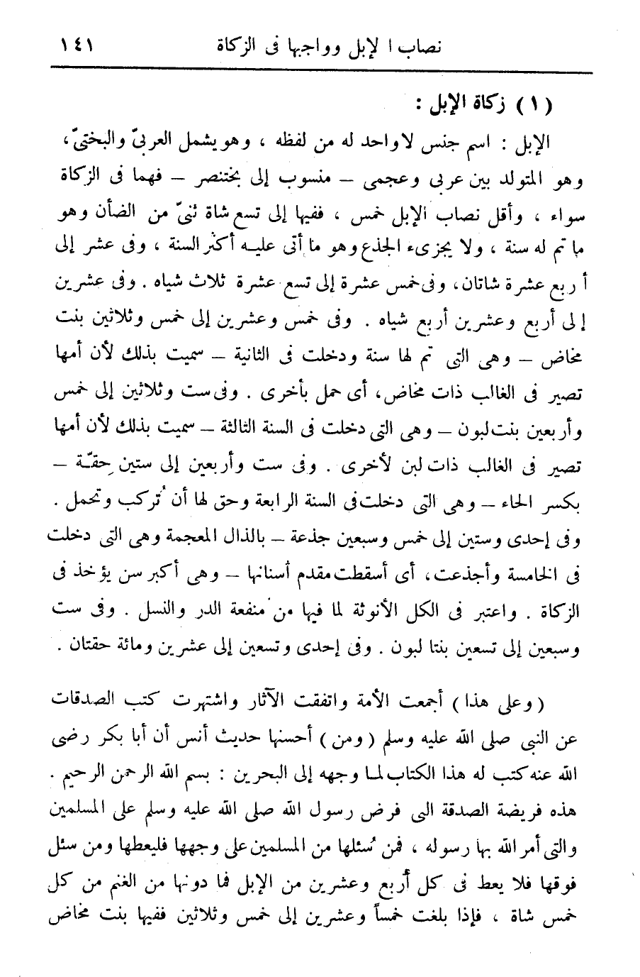 الإبل: اسم جنس لا واحد له من لفظه، وهو يشمل العربي والبختي، وهو المتولد بين عربي وعجمي- منسوب إلى بختنصر- فهما في الزكاة سواء، وأقل نصاب الإبل خمس، ففيها إلى تسع شاة ثني من الضأن وهو ما تم له سنة، ولا يجزئ الجذع وهو ما أتى عليه أكثر السنة، وفي عشر إلى أربع عشرة شاتان، وفي خمس عشرة إلى تسع عشرة ثلاث شياه. وفي عشرين إلى أربع وعشرين أربع شياه. وفي خمس وعشرين إلى خمس وثلاثين بنت مخاض- وهي التي تم لها سنة ودخلت في الثانية- سميت بذلك لأن أمها تصير في الغالب ذات لبن لأخرى. وفي ست وأربعين إلى ستين حقة- بكسر الحاء- وهي التي دخلت في السنة الرابعة وحق لها أن تركب وتحمل. وفي إحدى وستين إلى خمس وسبعين جذعة- بالذال المعجمة وهي التي دخلت في الخامسة وأجذعت، أي أسقطت مقدم أسنانها- وهي أكبر سن يؤخذ في الزكاة. واعتبر في الكل الأنوثة لما فيها من منفعة الدر والنسل. وفي ست وسبعين إلى تسعين بنتا لبون. وفي إحدى وتسعين إلى عشرين ومائة حقتان.