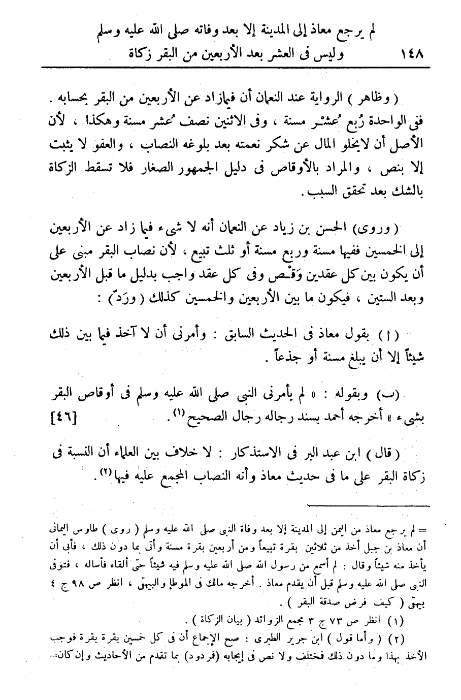 (قال) ابن عبد البر في الاستذكار: لا خلاف بين العلماء أن النسبة في زكاة البقر على ما في حديث معاذ وأنه النصاب المجمع عليه فيها (¬2).