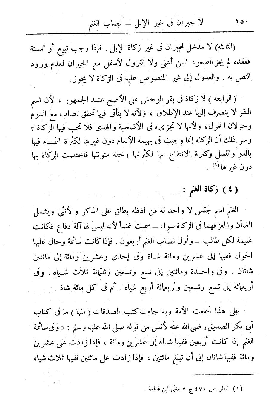 ... الغنم اسم جنس لا واحد له من لفظه يطلق على الذكر والأنثى ويشمل الضأن والمعز فهما في الزكاة سواء- سميت غنما لأنه ليس لها آلة دفاع فكانت غنيمة لكل طالب- وأول نصاب الغنم أربعون. فإذا كانت سائمة وحال عليها الحول ففيها إلى عشرين ومائة شاة وفي إحدى وعشرين ومائة إلى مائتين شاتان. وفي واحدة ومائتين إلى تسع وتسعين وثلاثمائة ثلاث شياه. وفي أربعمائة إلى تسع وتسعين وأربعمائة أربع شياه. ثم في كل مائة شاة.
