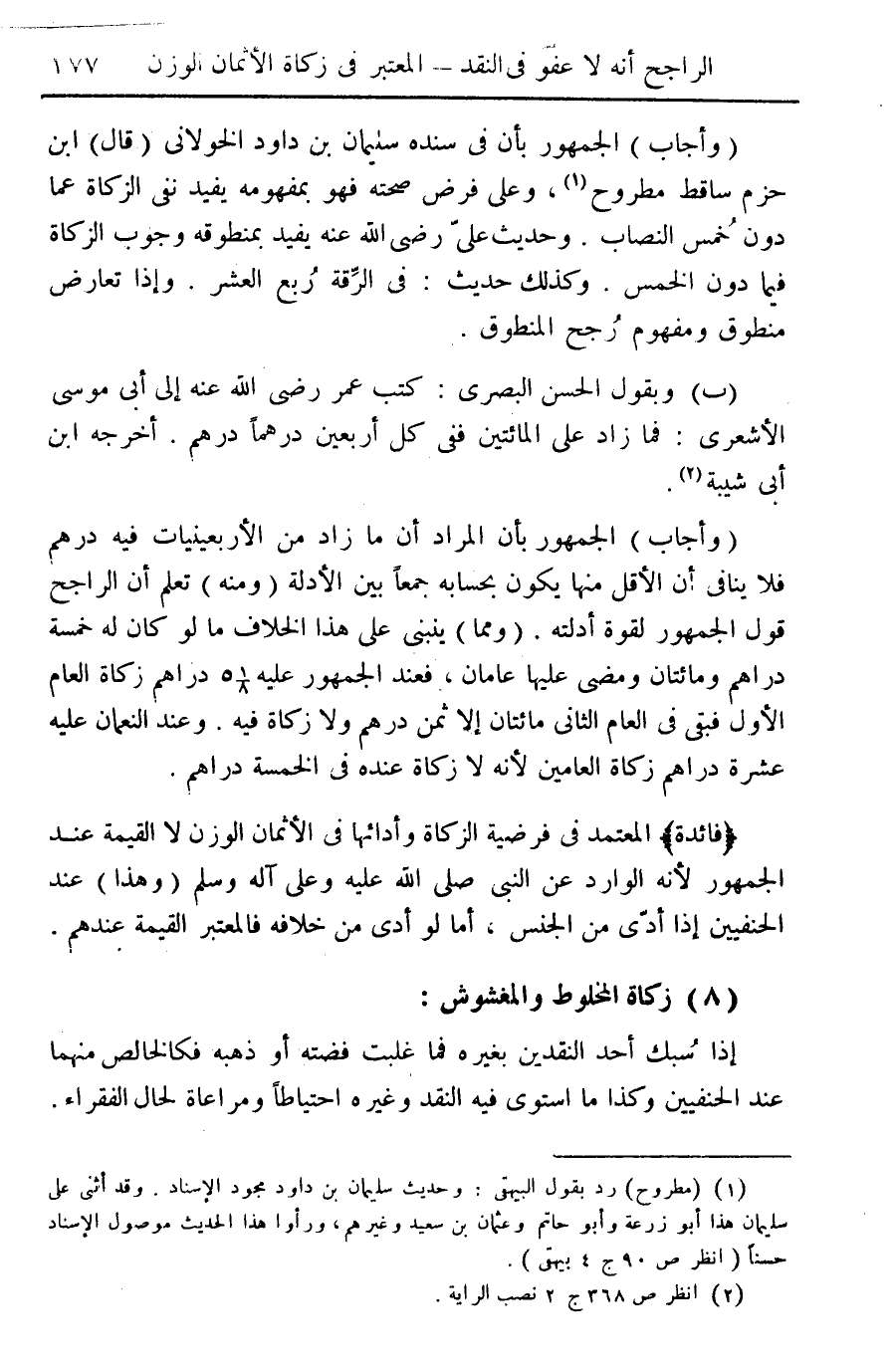 ... (وأجاب) الجمهور بأن المراد أن ما زاد من الأربعينيات فيه درهم فلا ينافى أن الأقل منها يكون بحسابه جمعا بين الأدلة (ومنه) تعلم أن الراجح قول الجمهور لقوة أدلته. (ومما) ينبني على هذا الخلاف ما لو كان له خمسة دراهم ومائتان ومضى عليها عامان، فعند الجمهور عليه 1/ 8 5 دراهم زكاة العام الأول فبقى في العام الثاني مائتان إلا ثمن درهم ولا زكاة فيه. وعند النعمان عليه عشرة دراهم زكاة العامين لأنه لا زكاة عنده في الخمسة دراهم.