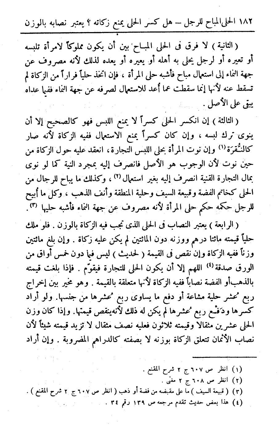 (الثالثة) إن انكر الحلي كسرا لا يمنع اللبس فهو كالصحيح إلا أن ينوي ترك لبسه، وإن كان كسرا يمنع الاستعمال ففيه الزكاة لأنه صار كالنقرة (¬1) وإن نوت المرأة بحلي اللبس التجارة، انعقد عليه حول الزكاة من حين نوت لأن الوجوب هو الأصل فانصرف إليه بمجرد النية كما لو نوى بمال التجارة القنية انصرف إليه بغير استعمال (¬2)، وكذلك ما يباح للرجال من الحلي كخاتم الفضة وقبيعة السيف وحلية المنطقة وأنف الذهب، وكل ما أبيح للرجل حكمه حكم حلي المرأة لأنه مصروف عن جهة النماء فأشبه حليها (¬3).