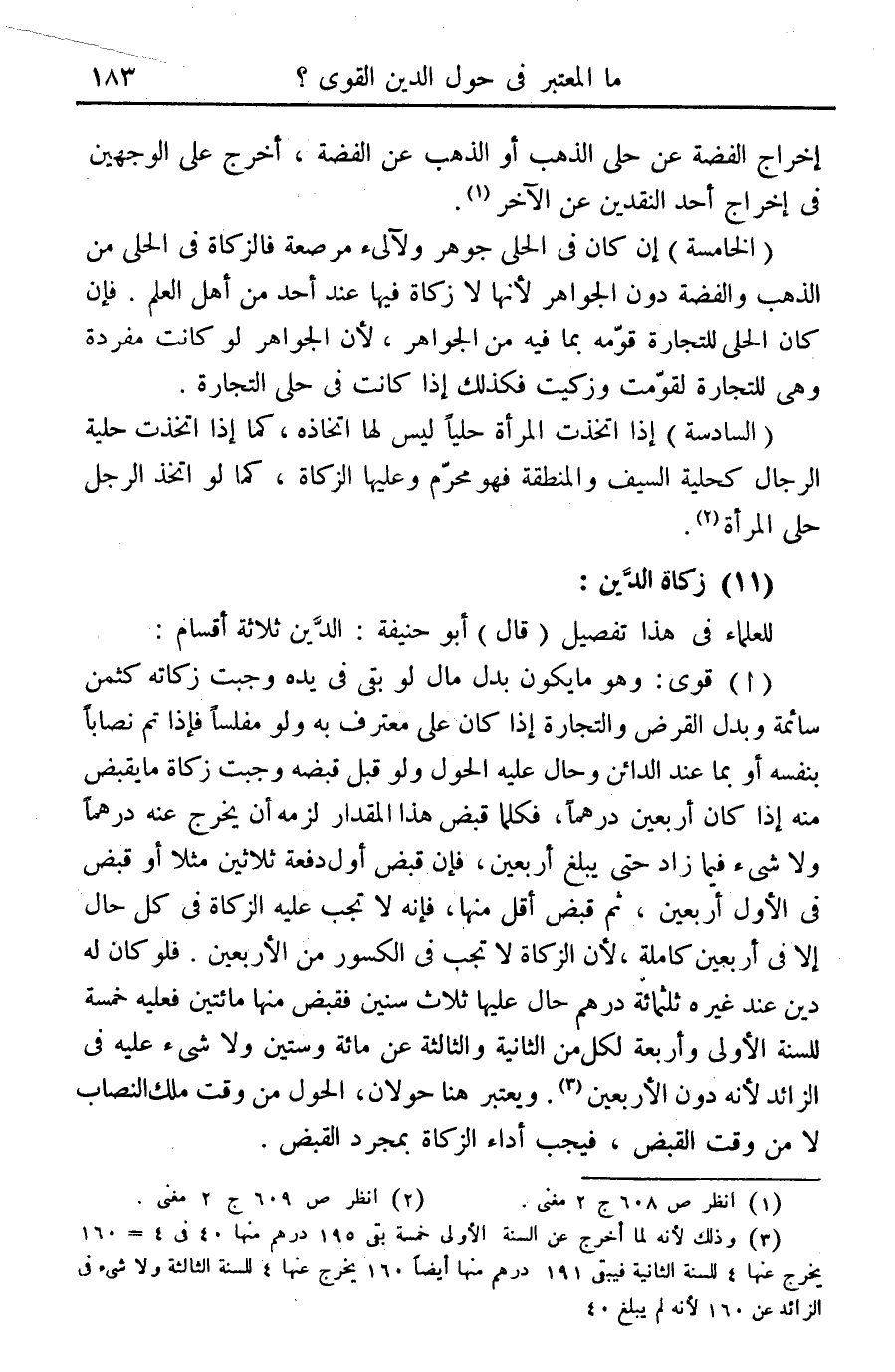 (أ) قوى: وهو ما يكون بدل مال لو بقى في يده وجبت زكاته كثمن سائمة وبدل القرض والتجارة إذا كان على معترف به ولو مفلسا فإذا تم نصابا بنفسه أو بما عند الدائن وحال عليه الحول ولو قبل قبضه وجبت زكاة ما يقبض منه إذا كان أربعين درهما، فكلما قبض هذا المقدار لزمه أن يخرج عنه درهما ولا شيء فيما زاد حتى يبلغ أربعين، فإن قبض أول دفعة ثلاثين مثلا أو قبض في الأول أربعين، ثم قبض أقل منها، فإنه لا تجب عليه الزكاة في كل حال إلا في أربعين كاملة، لأن الزكاة لا تجب في الكسور من الأربعين. فلو كان له دين عند غيره ثلاثمائة درهم حال عليه ثلاث سنين فقبض منها مائتين فعليه خمسة للسنة الأولى وأربعة لكل من الثانية والثالثة عن مائة وستين ولا شيء عليه في الزائد لأنه دون الأربعين (¬3). . ويعتبر هنا حولان، الحول من وقت مل النصاب لا من وقت القبض، فيجب أداء الزكاة بمجرد القبض.