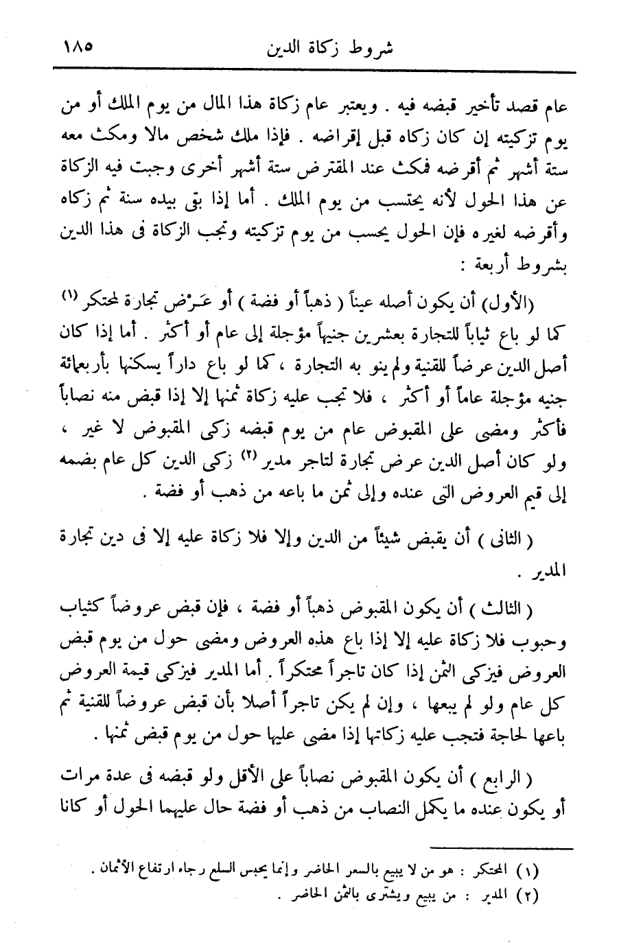 (الأولى) أن يكون أصله عينا (ذهبا أو فضة) أو عرض تجارة لمحتكر (¬1) كما لو باع ثيابا للتجارة بعشرين جنيها مؤجلة إلى عام أو أكثر. أما إذا كان أصل الدين عرضا للقنية ولم ينو به التجارة، كما لو باع دارا يسكنها بأربعمائة جنيه مؤجل عاما أو أكثر، فلا تجدب عليه زكاة ثمنها إلا إذا قبض منه نصابا فأكثر ومضى على المقبوض عام من يوم قبضه زكى المقبوض لا غير، ولو كان اصل الدين عرض تجارة لتاجر مدير (¬2) زكي الدين كل عام بضمه إلى قيم العروض التي عنده وإلى ثمن ما باعه من ذهب أو فضة.