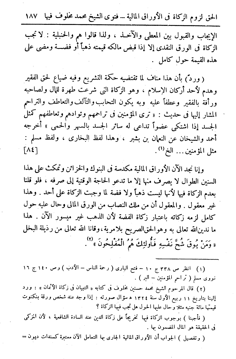 وإنا نجد الآن الأوراق المالية مكدسة في البنوك والخزائن وتمكث على هذا السنين الطوال لا يرف منها إلا ما تدعو الحاجة الوقتية إلى صرفه، فلو قلنا بعدم الزكاة فيها لأنها ليت ذهبا ولا فضة لما وجبت الزكاة على أحد. وهذا غير معقول. والمعقول أن من ملك النصاب من الورق المالي وحال عليه حول كامل لزمه زكاته باعتبار زكاة الفضة لأن الذهب غير ميسور الآن. هذا ما ندين الله تعالى به وهو الحق الصريح بلا مرية، وقانا الله تعالى من رذيلة البخل "ومن يوق شح نفسه فأولئك هم المفلحون" (¬2).