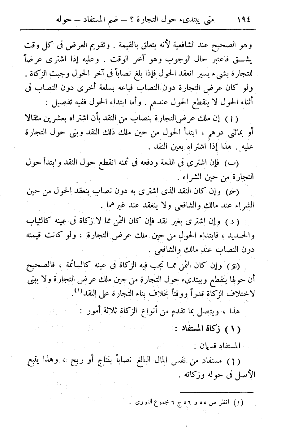 (أ) إن ملك عرض التجارة بنصاب من النقد بأن اشتراه بعشرين مثقالا أو بمائتي درهم، ابتدأ الحول من حين ملك ذلك النقد وبنى حول التجارة عليه. هذا إذا اشتراه بعين النقد.