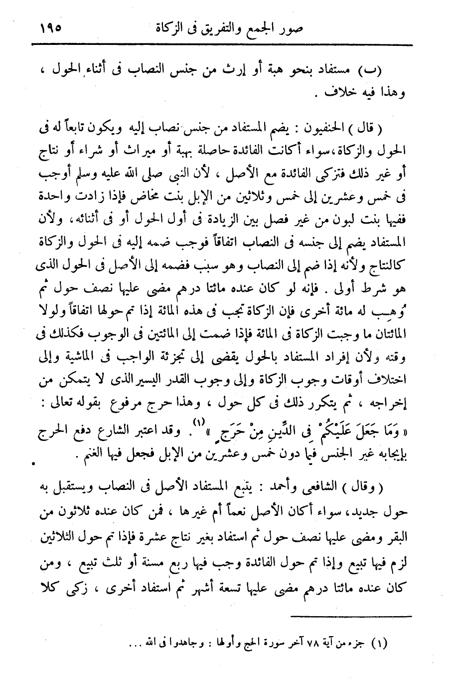 (قال) الحنفيون: يضم المستفاد من جنس نصاب إليه ويكون تابعا له في الحول والزكاة، سواء أكانت الفائدة حاصلة بهبة أو ميراث أو شراء أو نتاج أو غير ذلك فتزكى الفائدة مع الأصل، لأن النبي صلى الله عليه وسلم أوجب في خمس وعشرين إلى خمس ثلاثين من الإبل بنت مخاض فإذا زادت واحدة ففيها بنت لبون من غير فصل بين الزيادة في أول الحول أو في أثنائه، ولأن المستفاد يضم إلى جنسه في النصاب اتفاقا فوجب ضمه إليه في الحول والزكاة كالنتاج ولأنه إذا ضم إلى النصاب وهو سبب فضمه إلى الأصل في الحول الذي هو شرط أولي. فإنه لو كان عنده مائتا درهم مضى عليها نصف حول ثم وهب له مائة أخرى فإن الزكاة تجب في هذه المائة إذا تم حولها اتفاقا ولولا المائتان ما وجبت الزكاة في المائة فإذا ضمت إلى المائتين في الوجوب فكذلك في وقته ولأن إفراد المستفاد بالحول يقضي إلى تجزئة الواجب في الماشية وإلى اختلاف أوقات وجوب الزكاة وإلى وجوب القدر اليسير الذي لا يتمكن من إخراجه، ثم يتكرر ذلك في كل حول، وهذا حج مرفوع بقوله تعالى: "وما جعل عليكم في الدين من حرج" (¬1). وقد اعتبر الشارع دفع الحرج بإيجابه غير الجنس فيما دون خمس وعشرين من الإبل فجعل فيها الغنم.
