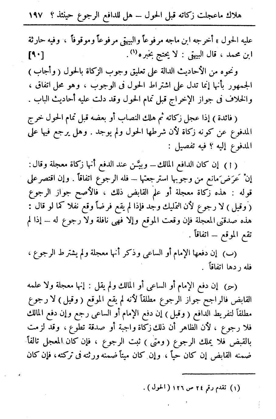 عليه الحول" أخرجه ابن ماجه مرفوعا والبيهقي مرفوعا وموقوفا، وفيه حارثة ابن محمد، قال البيهقي: لا يحتج بخبره (¬1). {90}