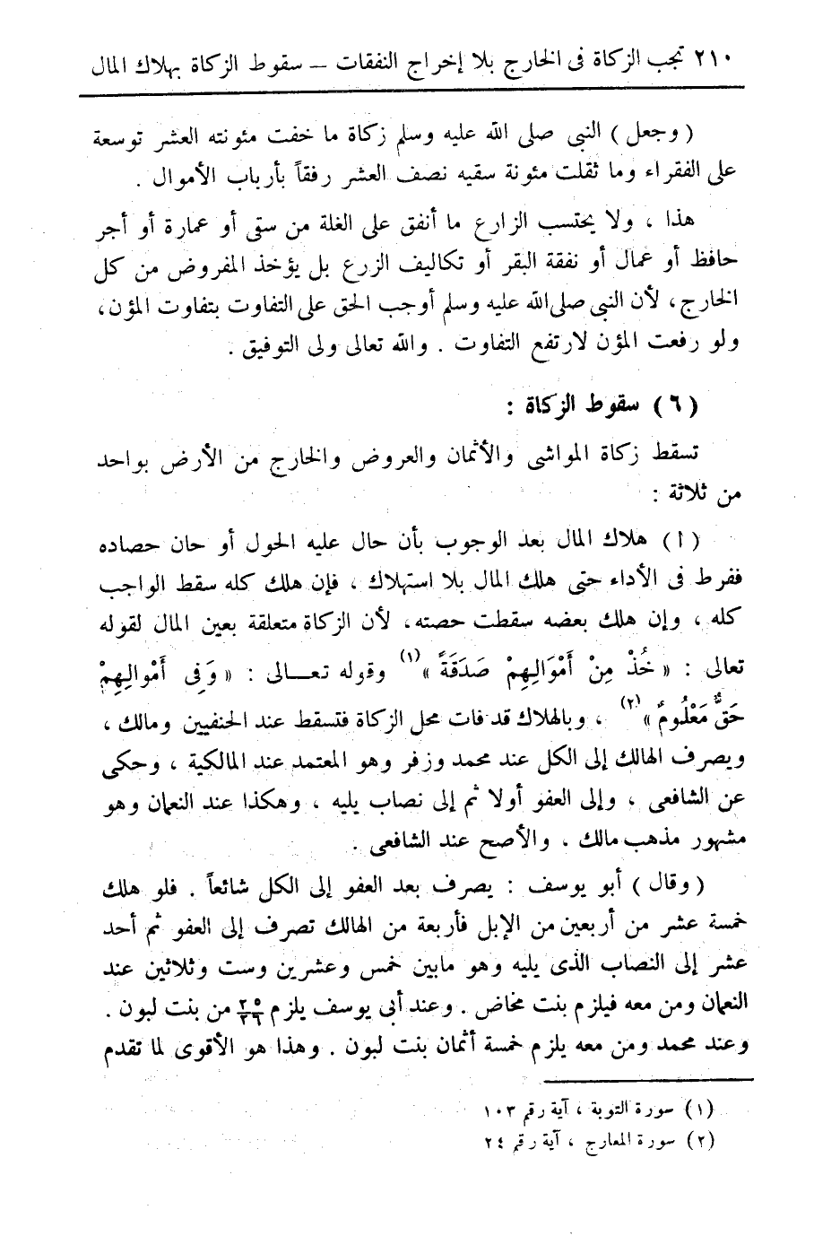 (أ) هلاك المال بعد الوجوب بأن حال عليه الحول أو حان حصاده ففرط في الأداء حتى هلك المال بلا استهلاك، فإن هلك كله سقط الواجب كله، وإن هلك بعضه سقطت حصته، لأن الزكاة متعلقة بعين المال لقوله تعالى: "خذ من أموالهم صدقة" (¬1) وقوله تعالى: "وفي أموالهم حق معلوم" (¬2)، وبالهلاك قد فات محل الزكاة فتسقط عند الحنفيين ومالك، ويصرف الهالك إلى الكل عند محمد وزفر وهو المعتمد عند المالكية، وحكى عن الشافعي، وإلى العفو أولا ثم إلى ناب يليه، وهكذا عند النعمان وهو مشهور مذهب مالك، والأصح عند الشافعي.