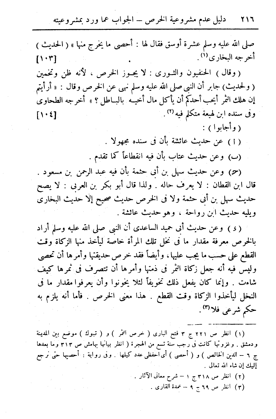(وقال) الحنفيون والثورى: لا يجوز الخرص، لأنه ظن وتخمين (ولحديث) جابر أن النبي صلى الله عليه وسلم نهى عن الخرص وقال: "أرأيتم إن هلك الثمر أيحب أحدكم أن يأكل مال أخيه بالباطل؟ " أخرجه الطحاوي وفي سنده ابن لهيعة متكلم فيه (¬2). {104}