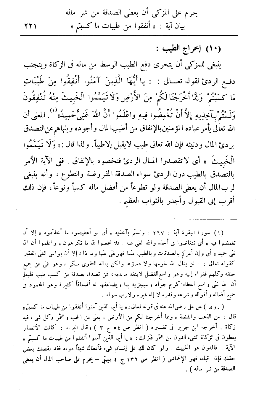 ... (روى) عن علي رضي الله عنه في قوله تعالى: "يا أيها الذين آمنوا أنفقوا من طيبات ما كسبتم" قال: من الذهب والفضة "ومما أخرجنا لكم من الأرض" يعني من الحب والثمر وكل شيء فيه زكاة. أخرجه ابن جرير في تفسيره (انظر ص 54 ج 3) وقال البراء: كانت الأنصار يعطون في الزكاة الشيء الدون من الثمر فنزلت: "يا أيها الذين آمنوا أنفقوا من طيبات ما كسبتم" الآية. فالدون هو الخبيث. ولو كان لك على إنان شيء فأعطاك شيئا دونه فقد نقصك بعض حقك قبلته فهو الإغماص (انظر ص 136 ج 4 بيهقي- يحرم على صاحب المال أن يعطي الصدقة من شر ماله).