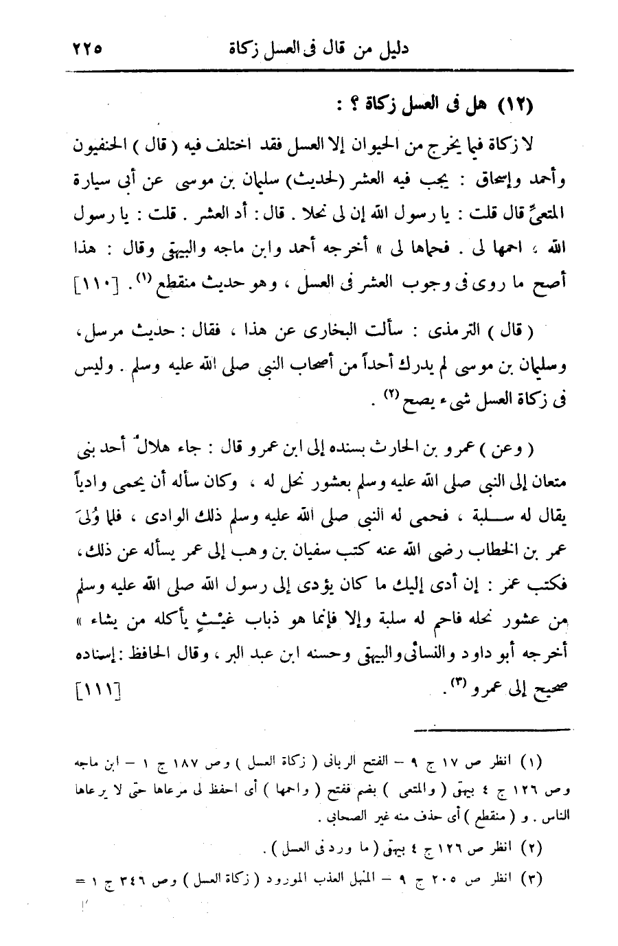 (وعن) عمرو بن الحارث بسنده إلى ابن عمرو قال: جاء هلال أحد بنى متعان إلى النبي صلى الله عليه وسلم بعشور نحل له، وكان سأله أن يحمي واديا يقال له سلبة، فحمى له النبي صلى الله عليه وسلم ذلك الوادي، فلما ولى عمر بن الخطاب رضي الله عنه كتب سفيان بن وهب إلى عمر يسأله عن ذلك، فكتب عمر: إن أدى إليك ما كان يؤدي إلى رسول الله صلى الله عليه وسلم من عشور نحله فأحم له سلبة وإلا فإنما هو ذباب غيث يأكله من يشاء" أخرجه أبو داود والنسائي والبيهقي وحسنه ابن عبد البر، وقال الحافظ: إسناده صحيح إلى عمرو (¬3). {111}