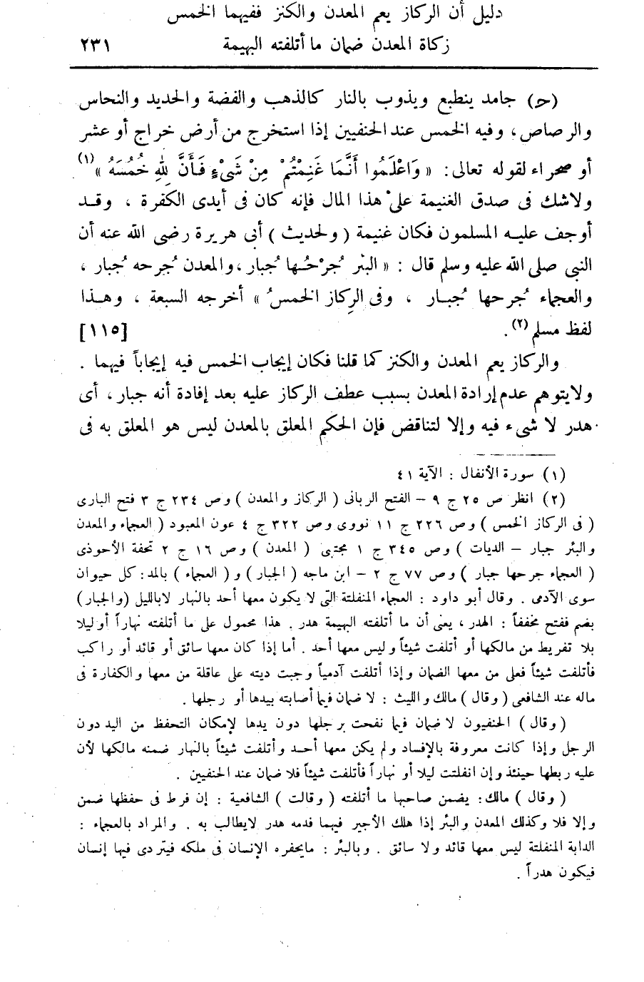 (جـ) جامد ينطبع ويذوب بالنار كالذهب والفضة والحديد والنحاس والرصاص، وفيه الخمس عند الحنفيين إذا استخرج من أرض خراج أو عشر أو صحراء لقوله تعالى: "واعلموا أنما غنمتم من شيء فأن لله خمسة" (¬1) ولا شك في صدق الغنيمة على هذا المال فإنه كان في أيدي الكفرة، وقد أوجف عليه المسلمون فكان غنيمة (ولحديث) أبي هريرة رضي الله عنه أن النبي صلى الله عليه وسلم قال: "البئر جرحها جبار، والمعدن جرحه جبار، والعجماء جرحها جبار، وفي الركاز الخمس" أخرجه السبعة، وهذا لفظ مسلم (¬2). . {115}