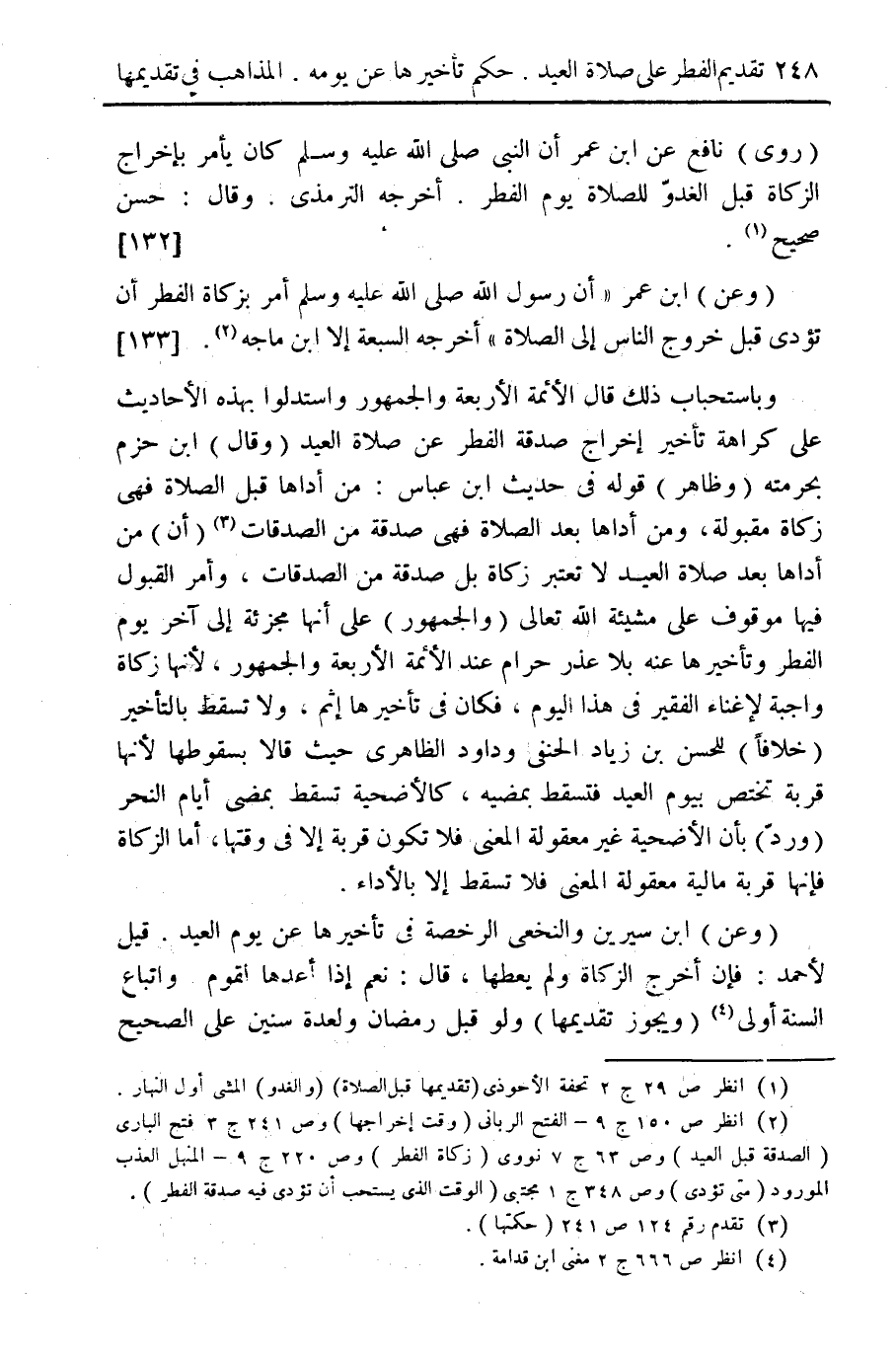 (¬2) انظر ص 150 ج 9 - الفتح الرباني (وقت إخراجها) وص 241 ج 3 فتح الباري (الصدقة قبل العيد) وص 63 ج 7 نووي (زكاة الفطر) وص 220 ج 9 - المنهل العذب المورود (متى تؤدي) وص 348 ج 1 مجتبي (الوقت الذي يستحب أن تؤدى فيه صدقة الفطر).