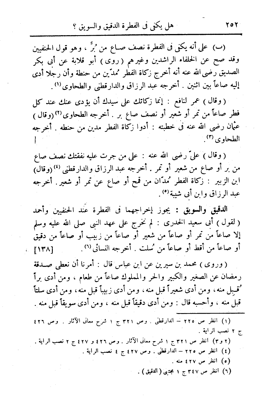 (ب) على أنه يكفي في الفطرة نصف صاع من بر، وهو قول الحنفيين وقد صح عن الخلفاء الراشدين وغيرهم (روى) أبو قلابة عن أبي بكر الصديق رضي الله عنه أنه أخرج زكاة الفطر مدين من حنطة وأن رجلا أدى إليه صاعا بين اثنين. أخرجه عبد الرزاق والدارقطني والطحاوي (¬1).