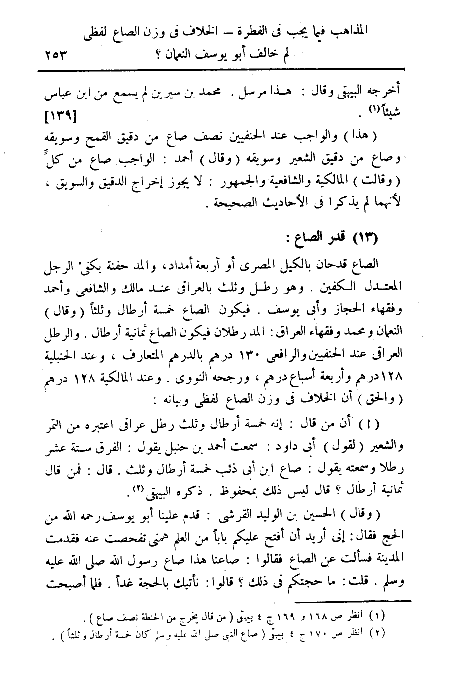 الصاع قدحان بالكيل المصري أو أربعة أمداد، والمد حفنة بكفي الرجل المعتدل الكفين. وهو رطل وثلث بالعراقي عند مالك والشافعي وأحمد وفقهاء الحجاز وأبي يوسف. فيكون الصاع خمس أرطال وثلثا (وقال) النعمان ومحمد وفقهاء العراق: المد رطلان فيكون الصاع ثمانية أرطال. والرطل العراقي عند الحنفيين والرافعي 130 درهم بالدرهم المتعارف، وعند الحنبلية 128 درهم وأربعة أسباع درهم، ورجحه النووي. وعند المالكية 128 درهم (والحق) أن الخلاف في وزن الصاع لفظي وبيانه: