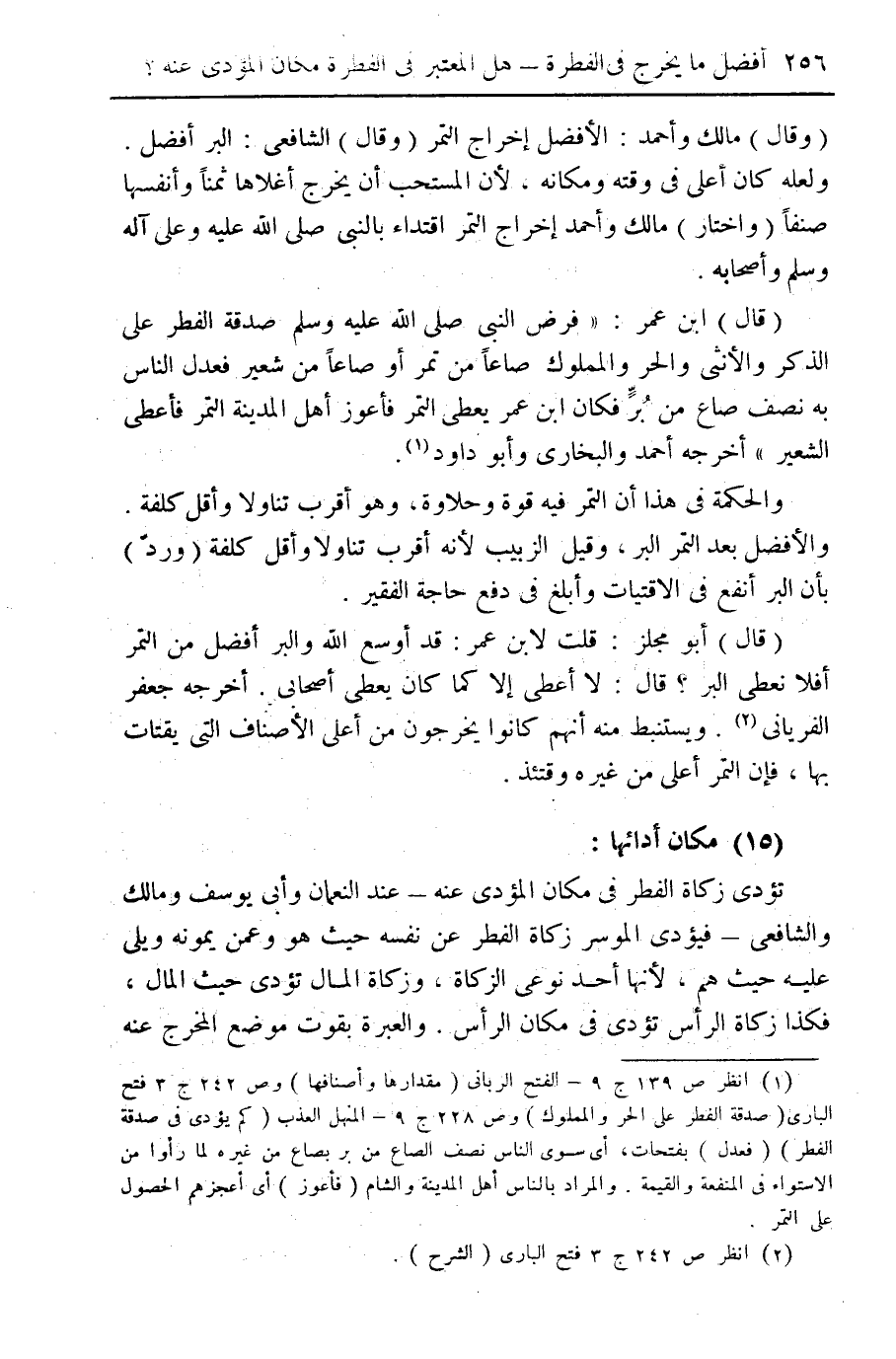 (قال) أبو مجلز: قلت لابن عمر: قد أوسع الله والبر أفضل من التمر أفلا نعطي البر؟ قال: لا أعطي إلا كما كان يعطي أصحابي. أخرجه جعفر الفرياني (¬2). ويستنبط منه أنهم كانوا يخرجون من أعلى الأصناف التي يقتات بها، فإن التمر أعلى من غيره وقتئذ.