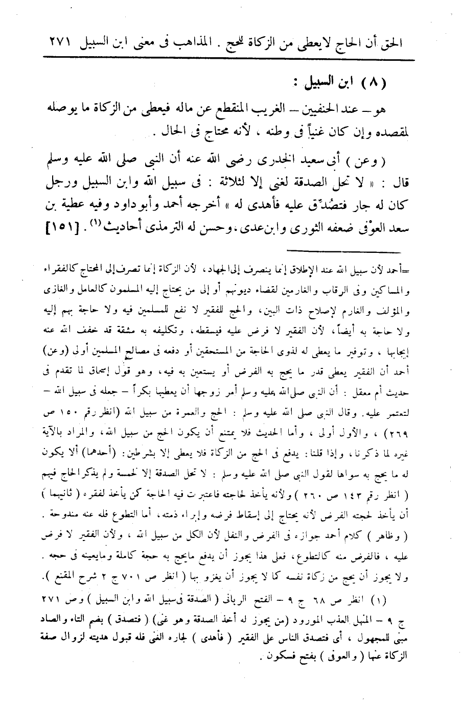 = أحمد لأن سبيل الله عند الإطلاق إنما يتصرف إلى الجهاد، لان الزكاة انما تصرف الى المحتاج كالفقراء والمساكين وفى الرقاب والغارمين لقضاء ديونهم أو على من يحتاج إليه المسلمون كالعامل والغازي والمؤلف والغارم لإصلاح ذات البين، والحجد للفقير لا نفع للمسلمين فيه ولا حاجة بهم عليه ولا حاجة به أيضا، لأن الفقير لا فرض عليه فيسقطه، وتكليفه به مشقة قد خفف الله عنه إيجابها، وتوفير ما يعطي له لذوي الحاجة من المستحقين أو دفعه في مصالح المسلمين اولى (وعن) أحمد أن الفقير يعطي قدر ما يحج به الفرض أو يستعين به فيه، وهو قول إسحاق لما تقدم في حديث أم معقل: أن النبي صلى الله عليه وسلم أمر زوجها أن يعطيها بكرا- جعله في سبيل الله- لتعتمر عليه .. وقال النبي صلى الله عليه وسلم: الحج والعمرة من سبيل الله (أنظر رقم 150 ص 269)، والأول أولى، وأما الحديث فلا يمتنع أن يكون الحج من سبيل الله، والمراد بالآية غيره لما ذكرنا، وإذا قلنا: يدفع في الحج من الزكاة فلا يعطي إلا بشرطين: (أحدهما) ألا يكون له ما يحج به سواها لقول النبي صلى الله عليه وسلم: لا تحل الصدقة إلا لخمسة ولم يذكر الحاج فيهم (أنظر رقم 143 ص 260) ولأنه يأخذ لحاجته فاعتبرت فيه الحاجة كمن يأخذ لفقره (ثانيهما) أن يأخذ لحجته الفرض لأنه يحتاج إلى إسقاط فرضه وإبراهء ذمته، أما التطوع فله عنه مندوحة. (وظاهر) كلام أحمد جوازه في الفرض والنقل لأن الكل من سبيل الله، ولأن الفقير لا فرض عليه، فالفرض منه كالتطوعن فعلى هذا يجوز أن يدفع ما يحج به حجة كاملة وما يعينه في حجه. ولا يجوز أن يحج من زكاة نفسه كما لا يجوز أن يغزو بها (أنظر ص 701 ج 2 شرح المقنع).