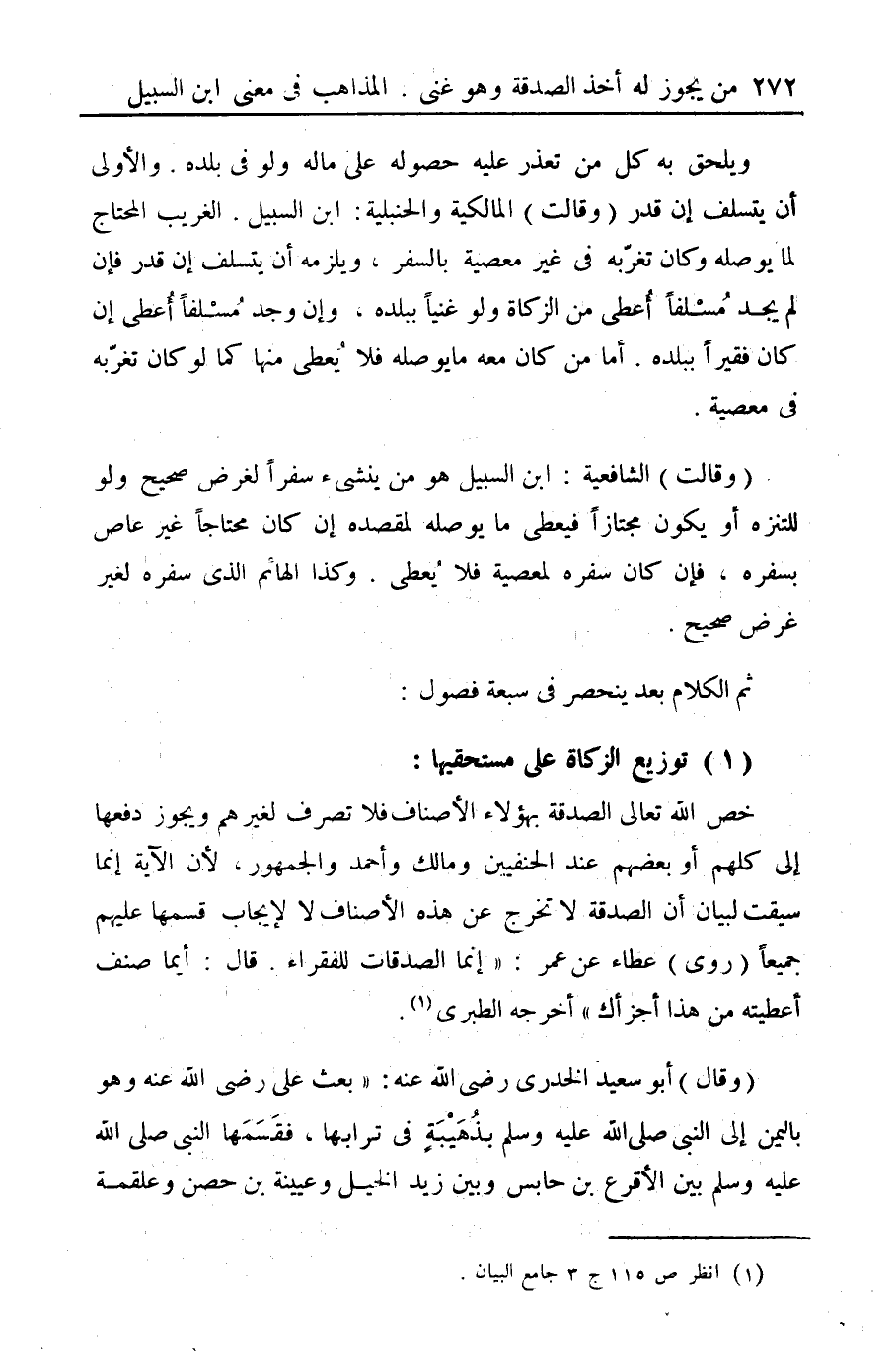 ... (وقالت) الشافعية: ابن السبيل هو منن ينشئ سفرا لغرض صحيح ولو للتنزه أو يكون مجتازا فيعطي ما يوصله لمقصده إن كان محتاجا غير عاص بسفره، فإن كان سفره لمعصية فلا يعطي. وكذا الهائم الذي سفره لغيره غرض صحيح.